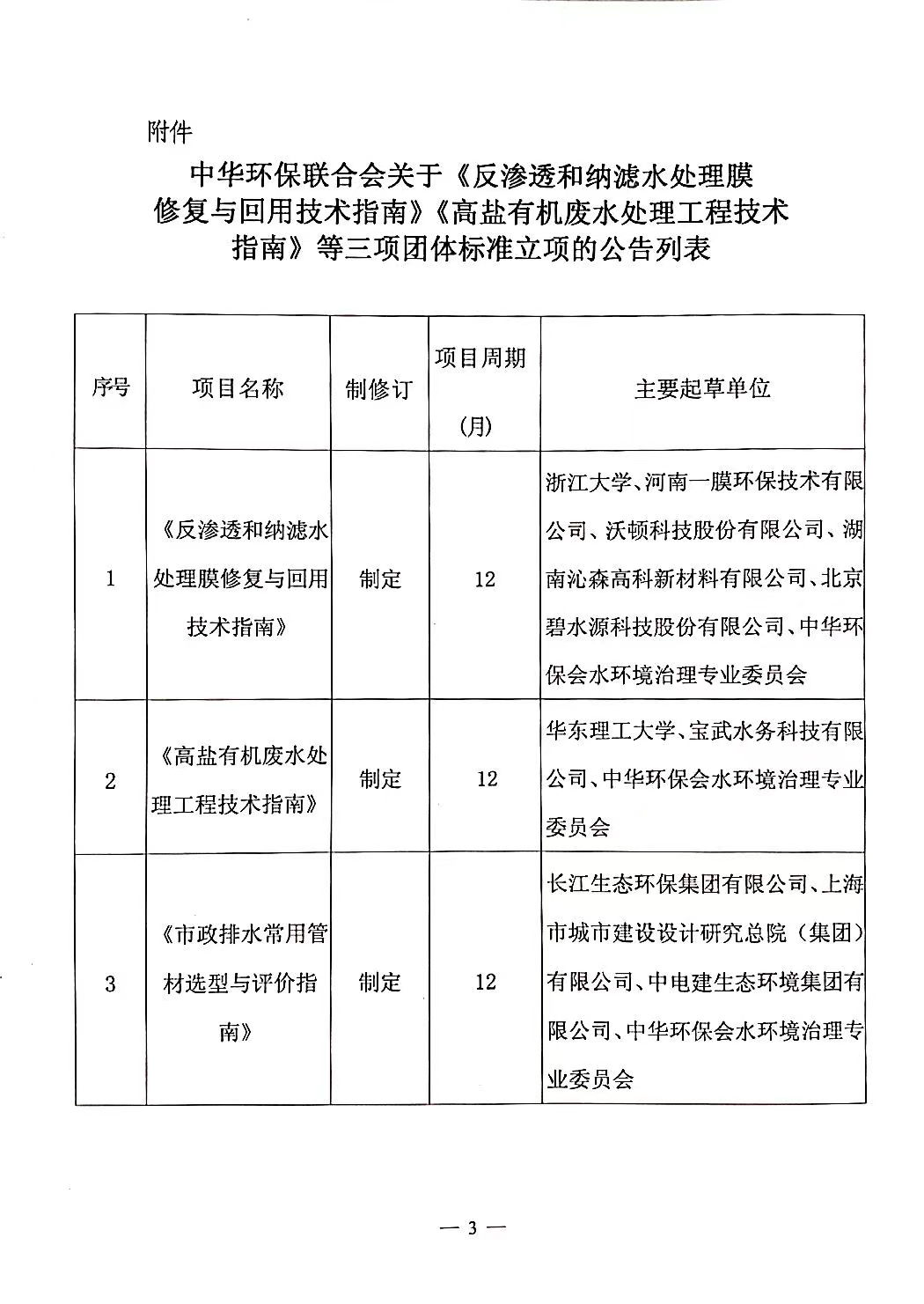关于《反渗透和纳滤水处理膜修复与回用技术指南》《高盐有机废水处理工程技术指南》等 三项团体标准立项的公告