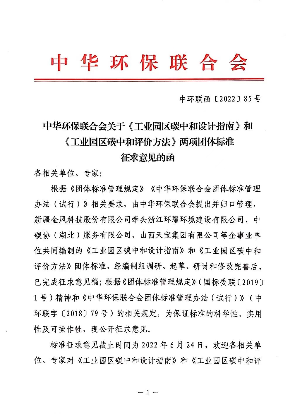 中华环保联合会关于《工业园区碳中和设计指南》和《工业园区碳中和评价方法》 两项团体标准征求意见的函