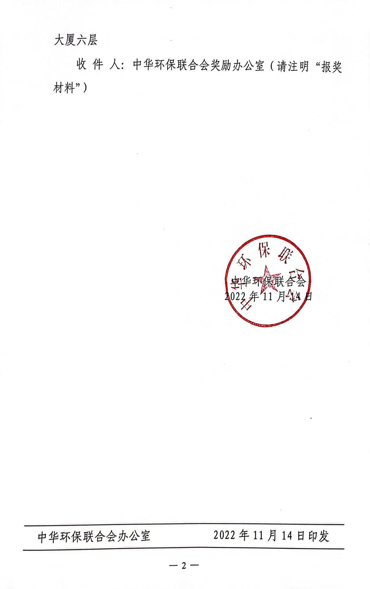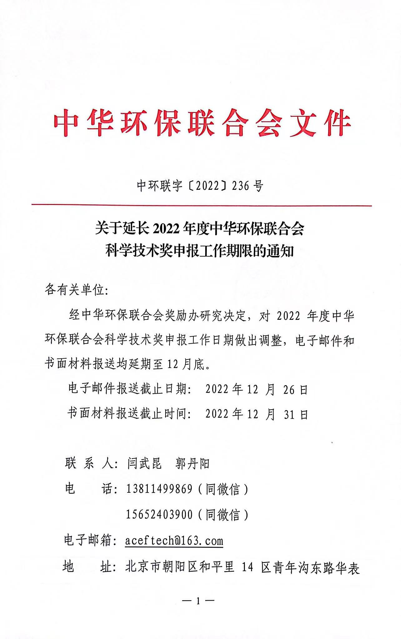 关于延长2022年度中华环保联合会科学技术奖申报工作期限的通知