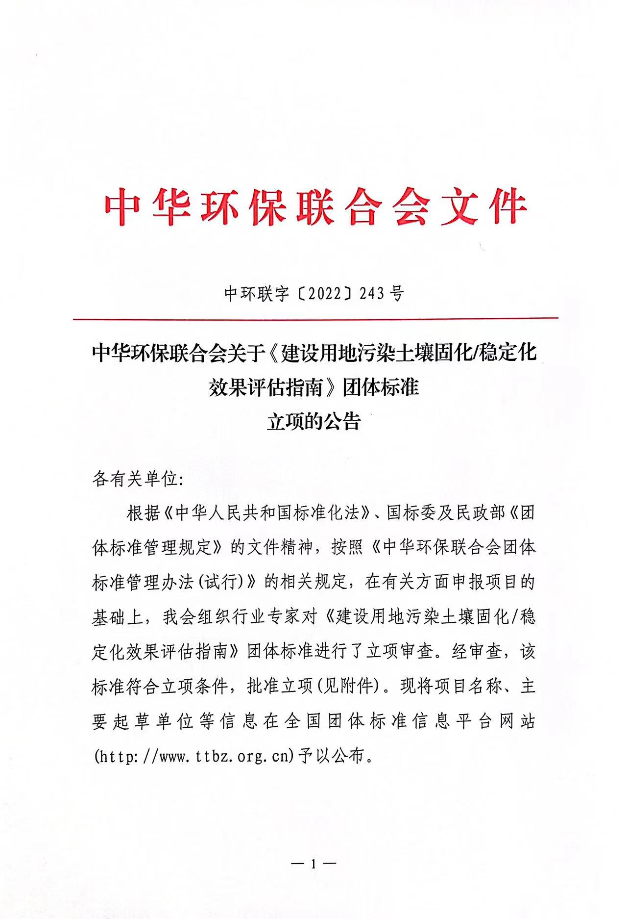 关于《建设用地污染土壤固化/稳定化效果评估指南》团体标准立项的公告