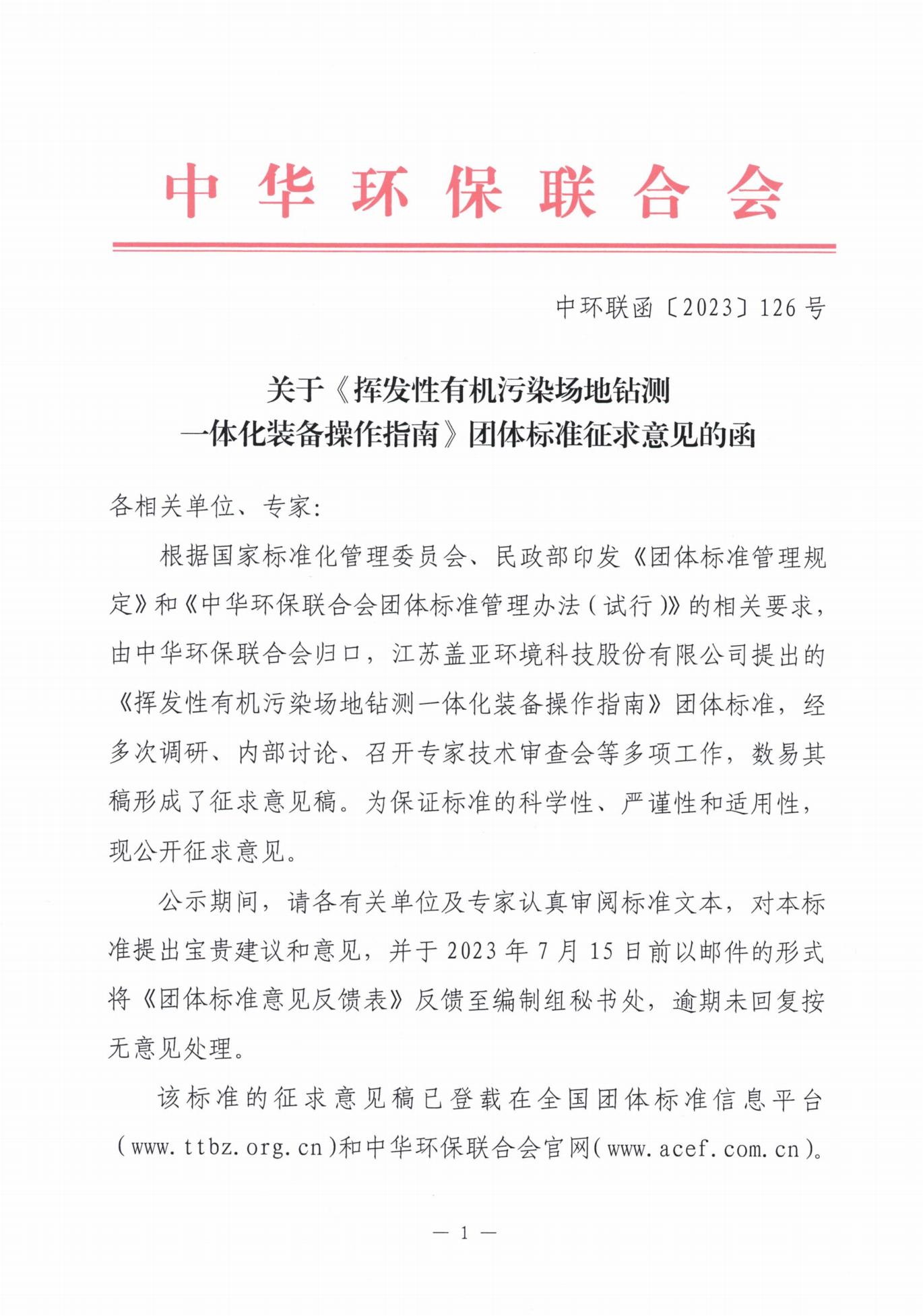关于《挥发性有机污染场地钻测一体化装备操作指南》团体标准征求意见的函