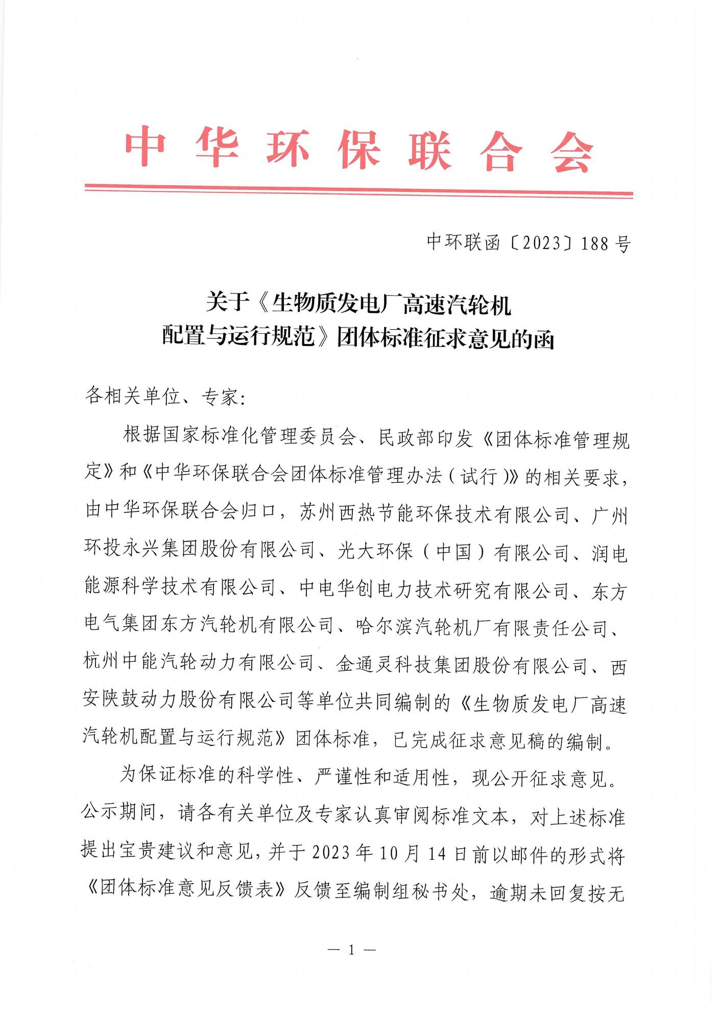 关于《生物质发电厂高速汽轮机配置与运行规范》团体标准征求意见的函