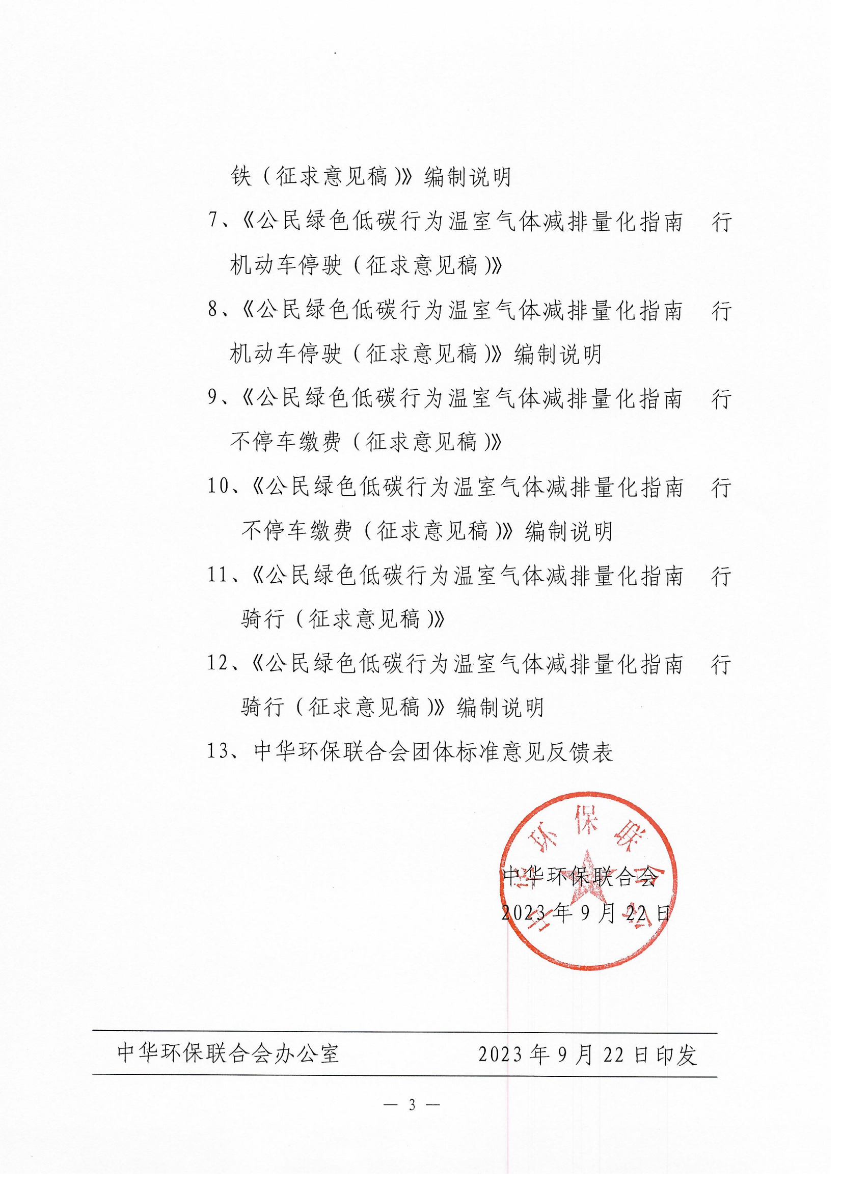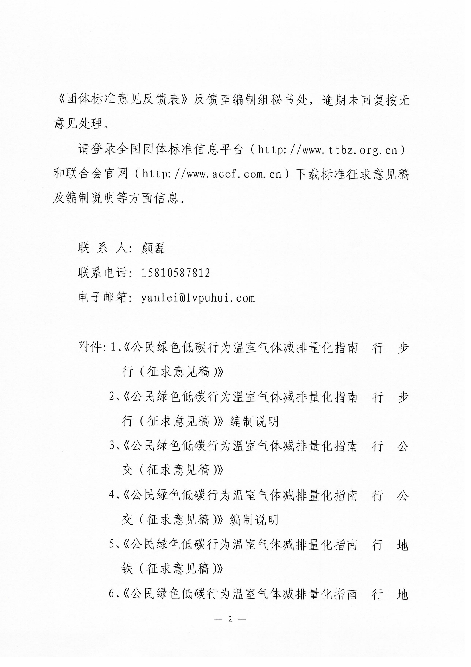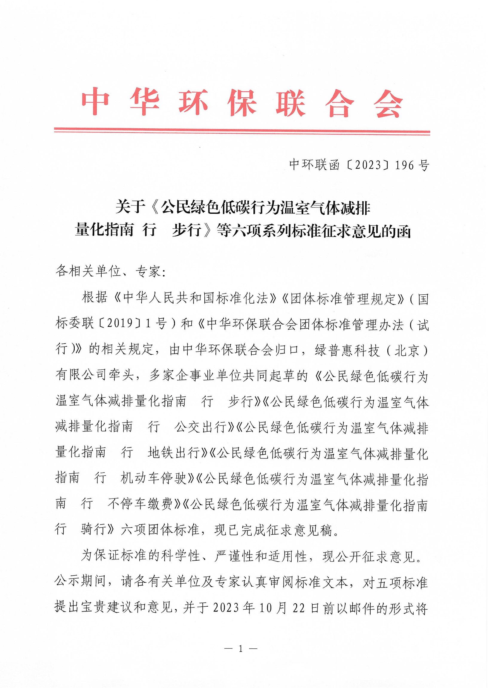 关于《公民绿色低碳行为温室气体减排量化指南 行 步行》等六项系列标准征求意见的函