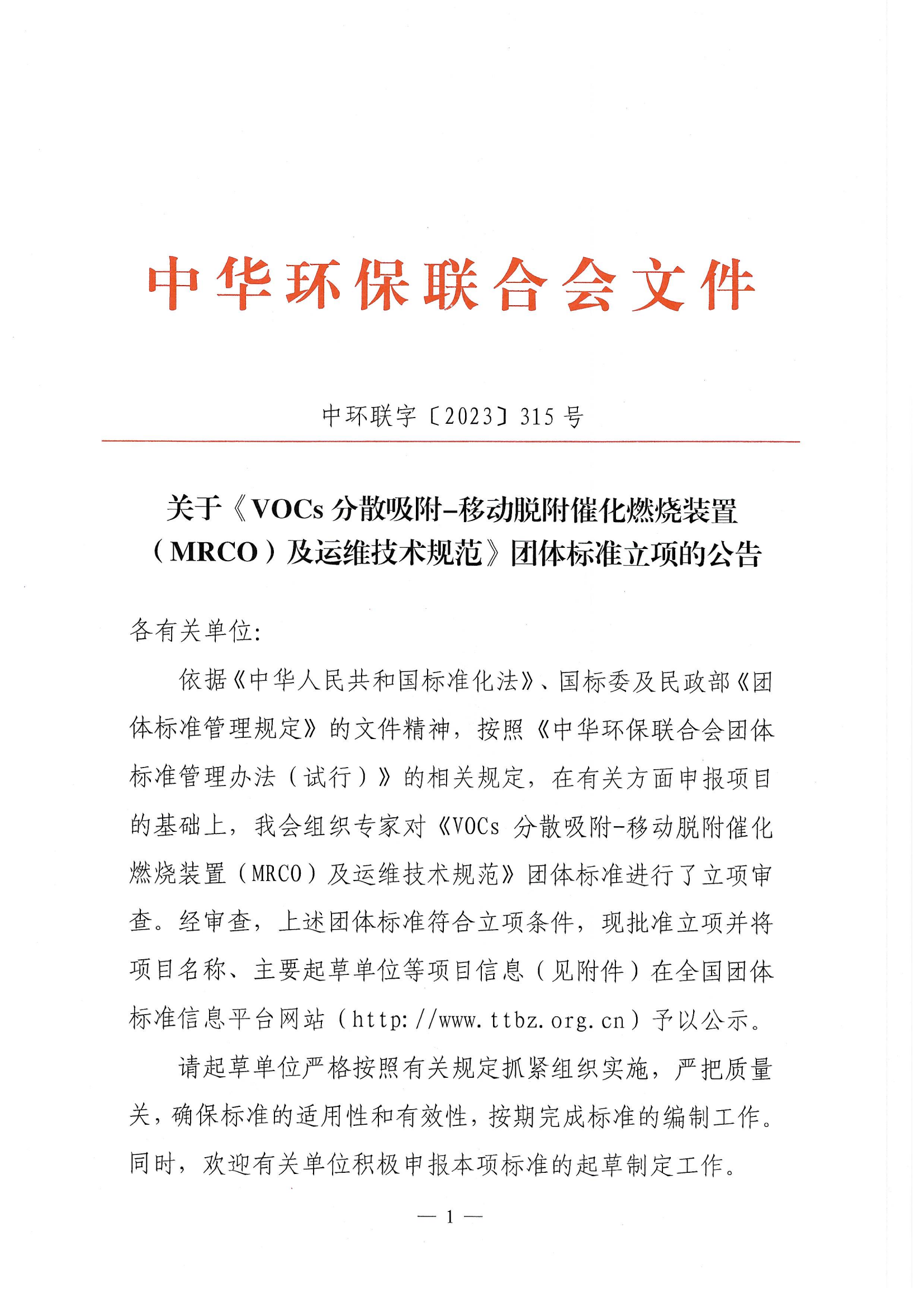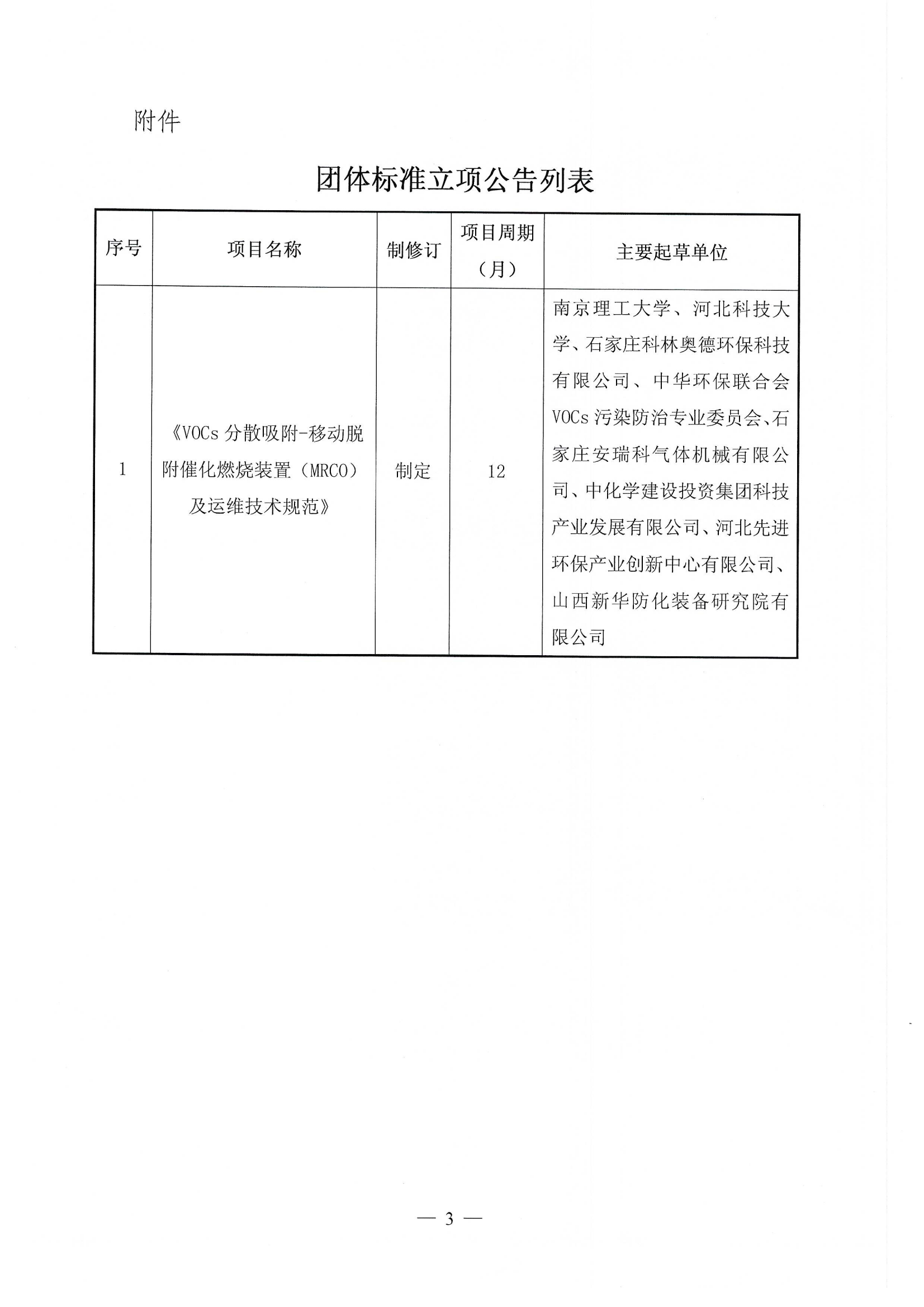 关于《VOCs分散吸附-移动脱附催化燃烧装置(MRCO)及运维技术规范》团体标准立项的公告