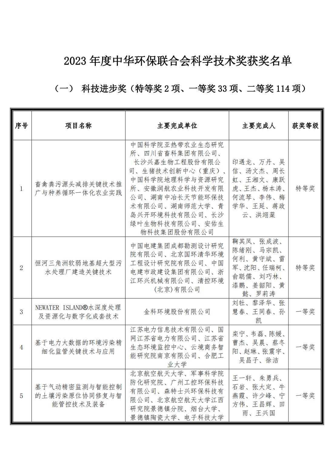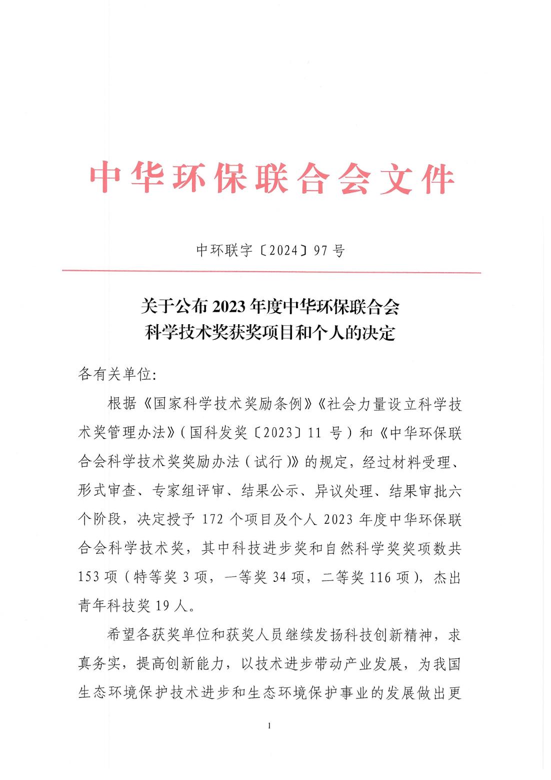 关于公布2023年度中华环保联合会科学技术奖获奖项目和个人的决定