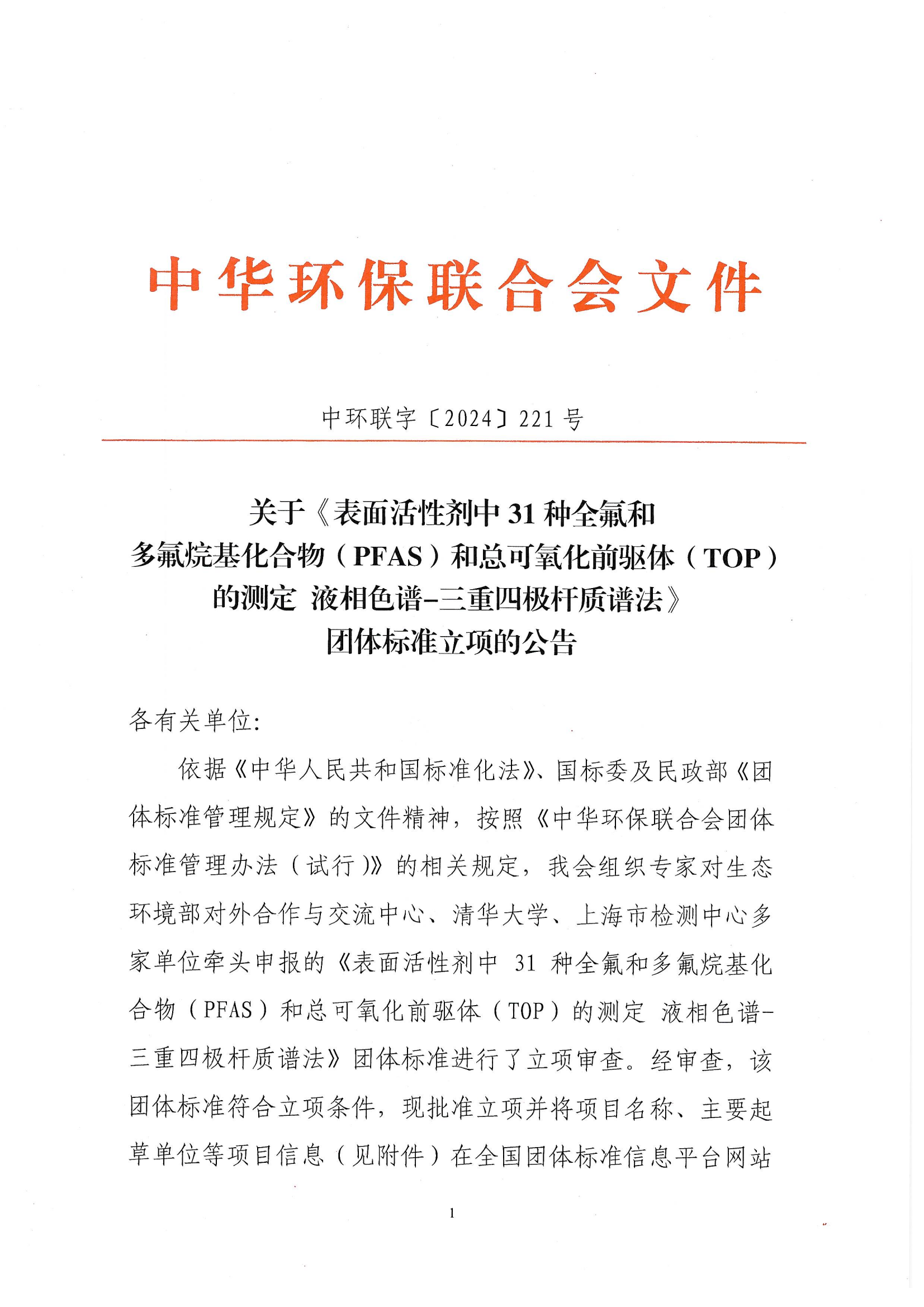 关于《表面活性剂中31种全氟和多氟烷基化合物(PFAS)和总可氧化前驱体(TOP)的测定 液相色谱-三重四极杆质谱法》 团体标准立项的公告