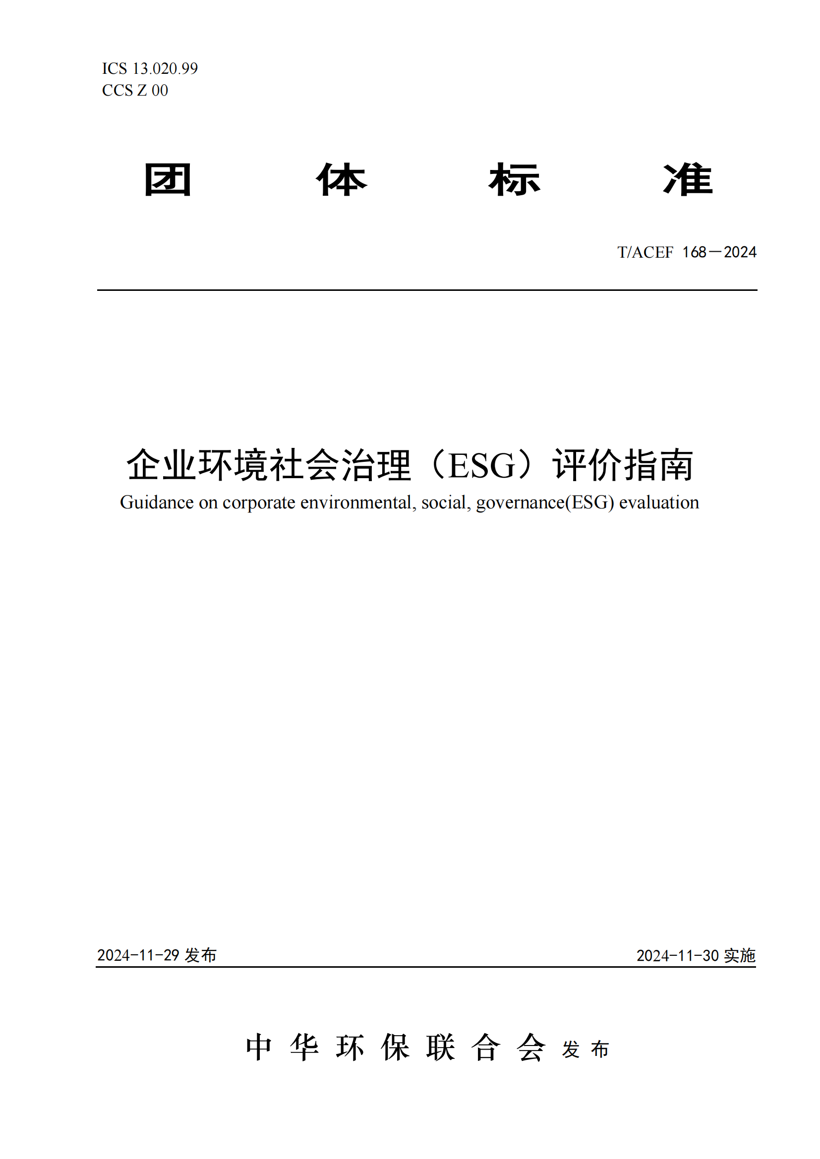 2024年11月29日,中华环保联合会首部ESG团体标准—《企业环境社会治理(ESG)评价指南》(T/ACEF 168—2024)正式发布,自2024年11月30日开始实施。