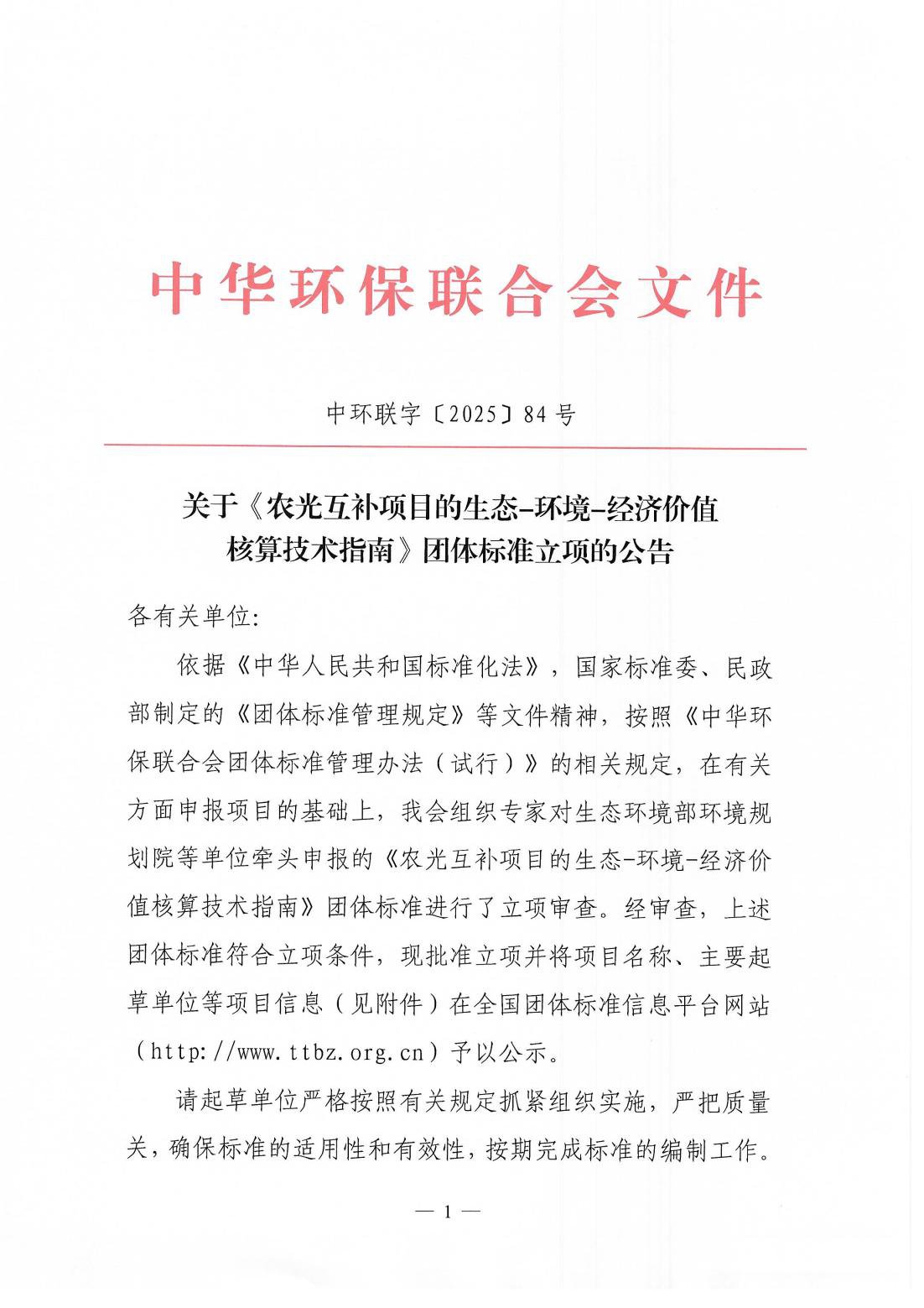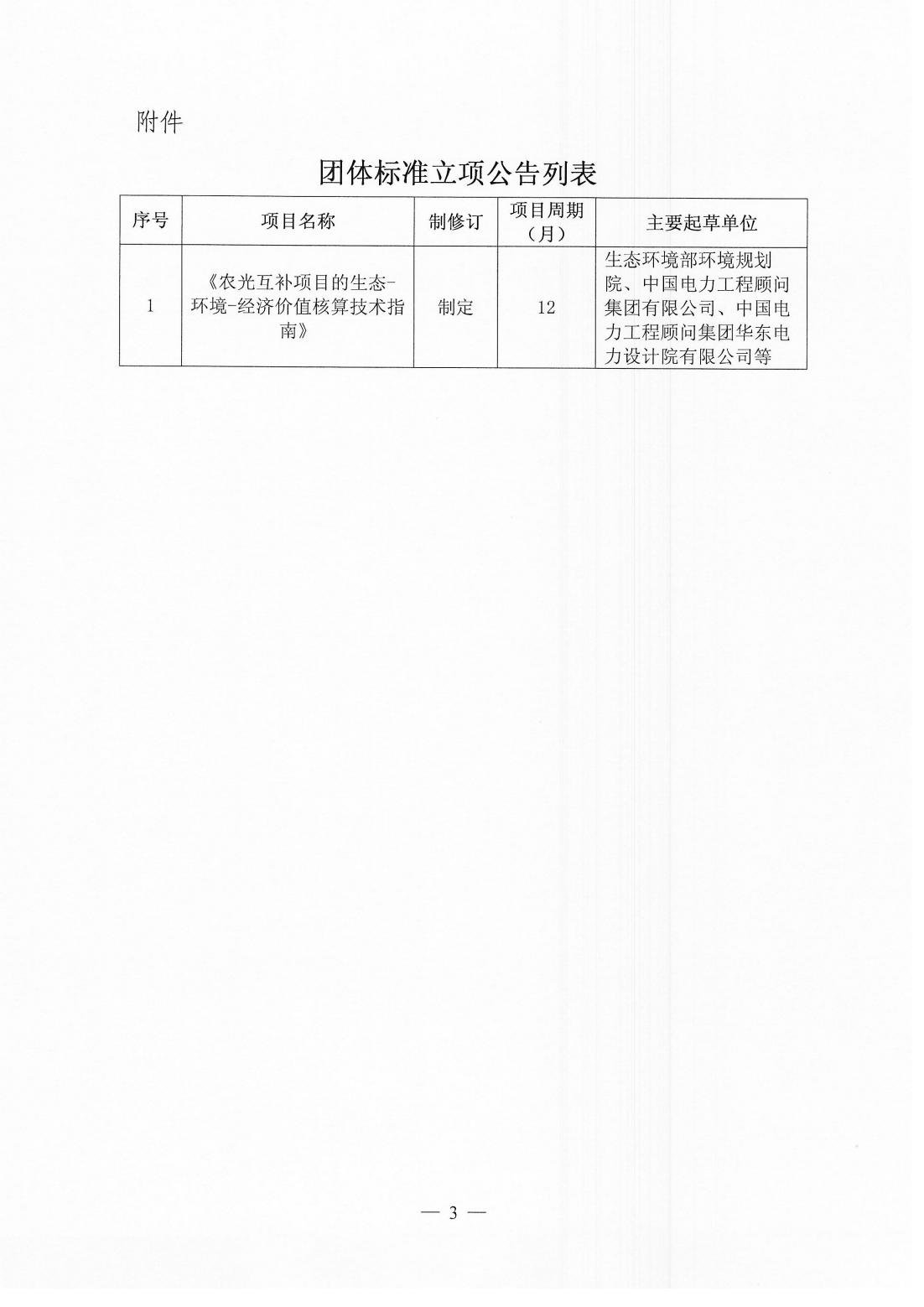 关于《农光互补项目的生态-环境-经济价值核算技术指南》团体标准立项的公告