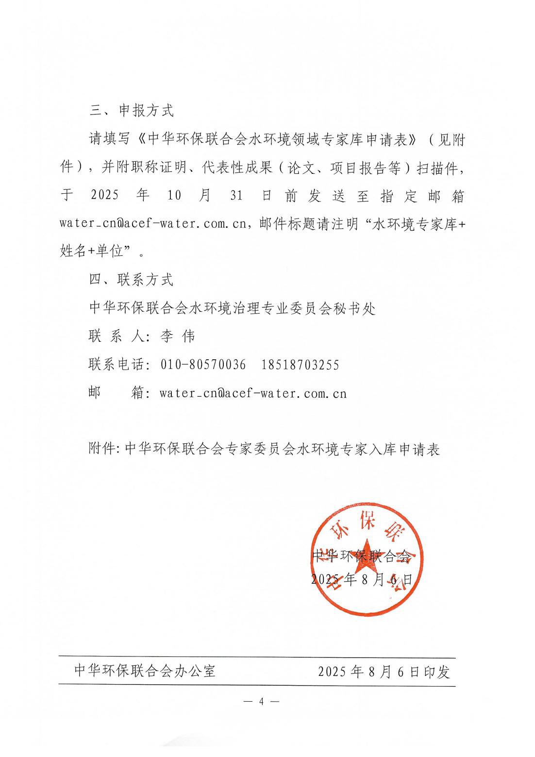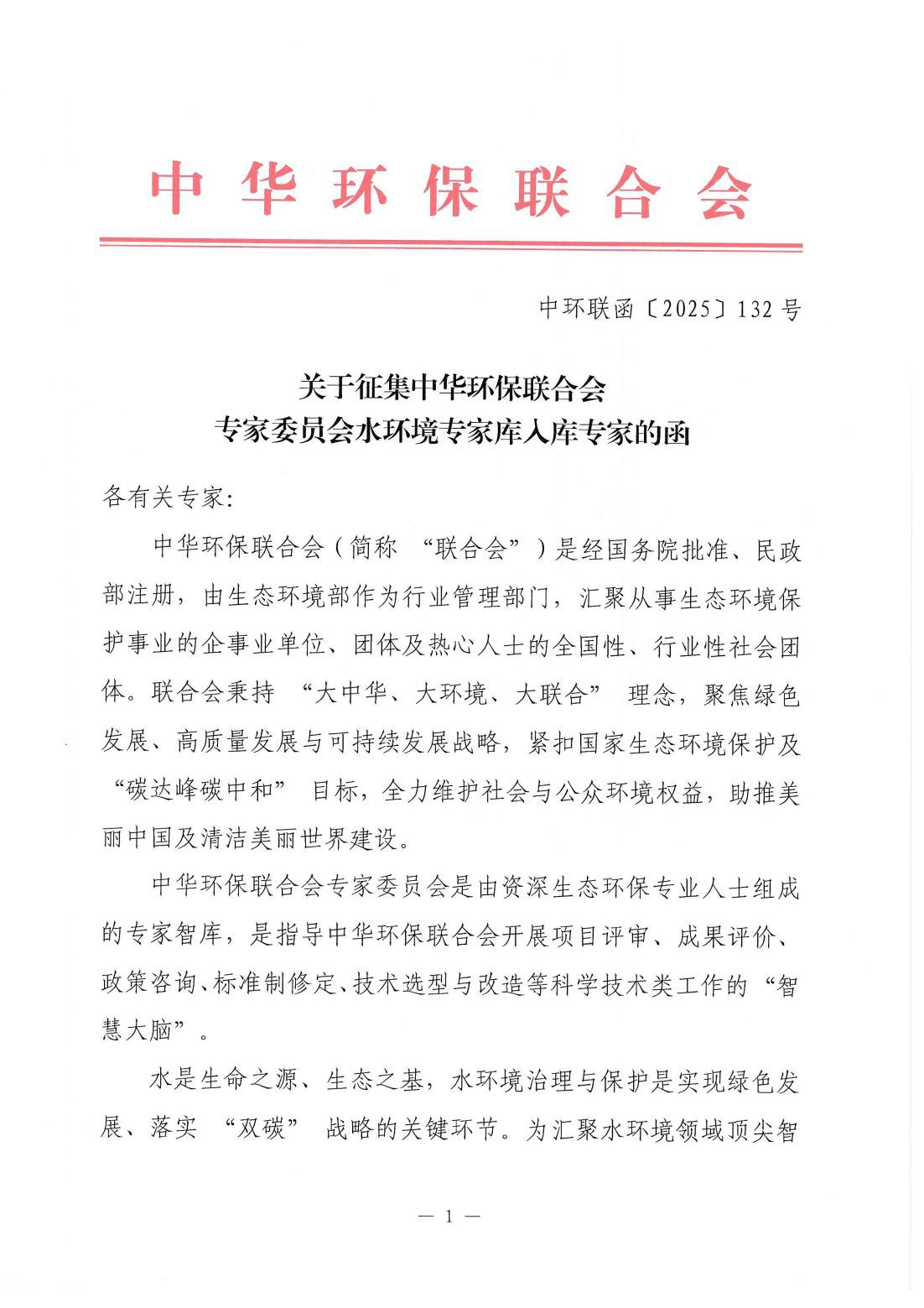 关于征集中华环保联合会专家委员会水环境专家库入库专家的函