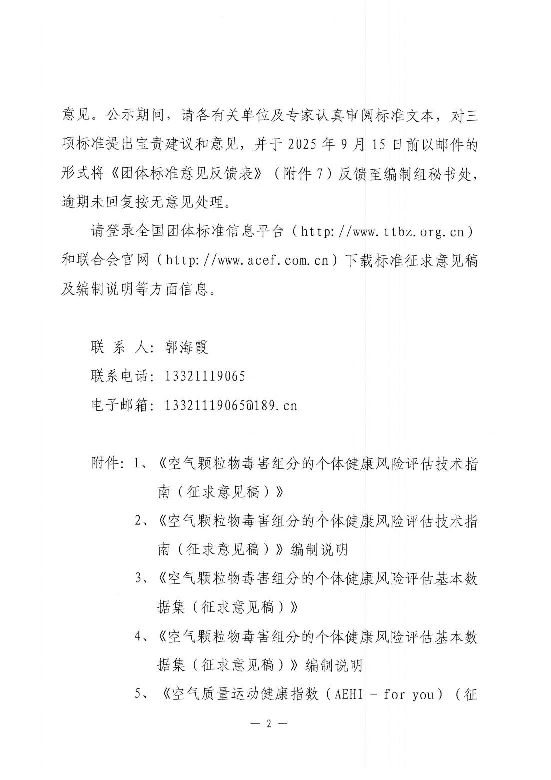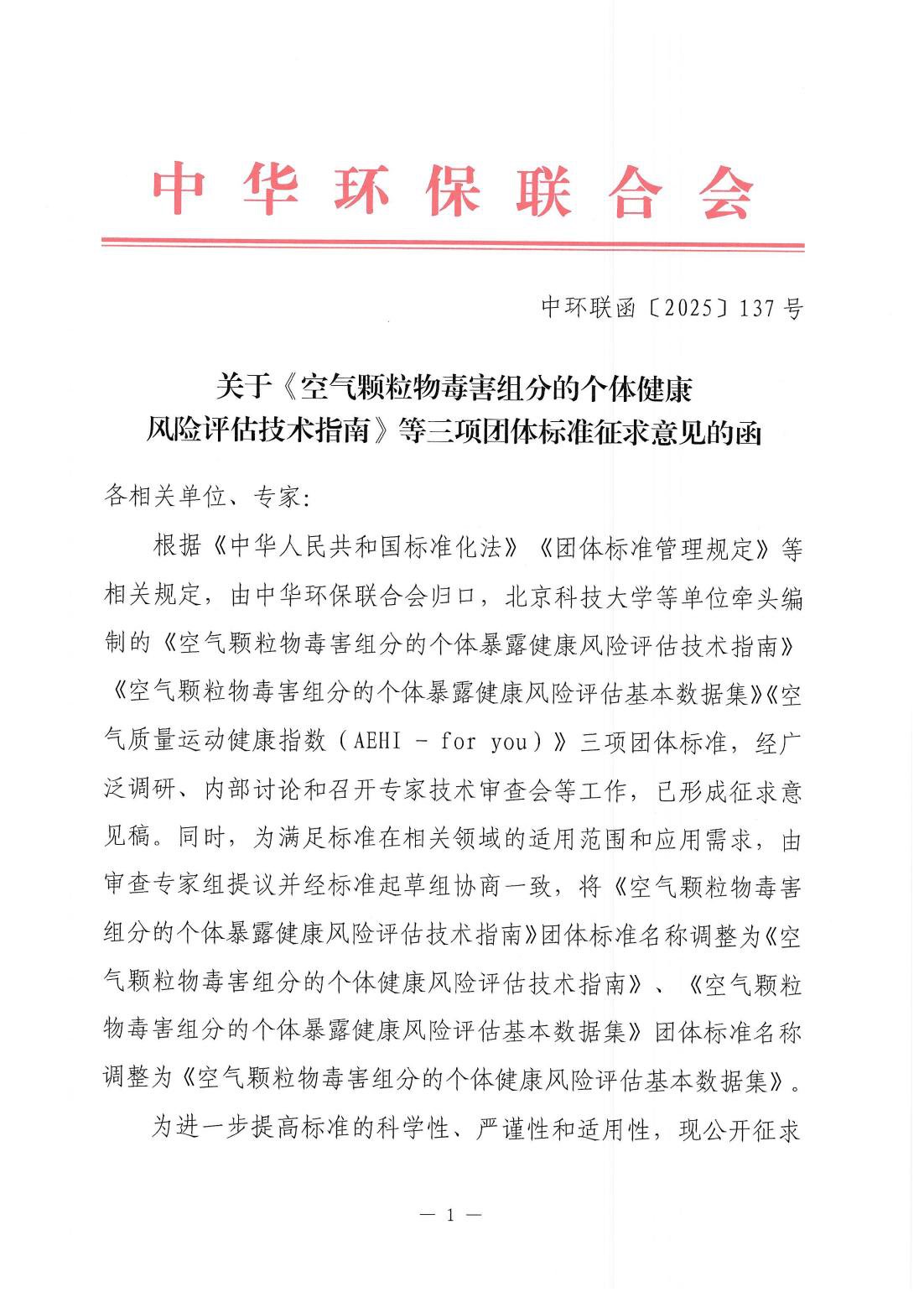 关于《空气颗粒物毒害组分的个体健康风险评估技术指南》等三项团体标准征求意见的函