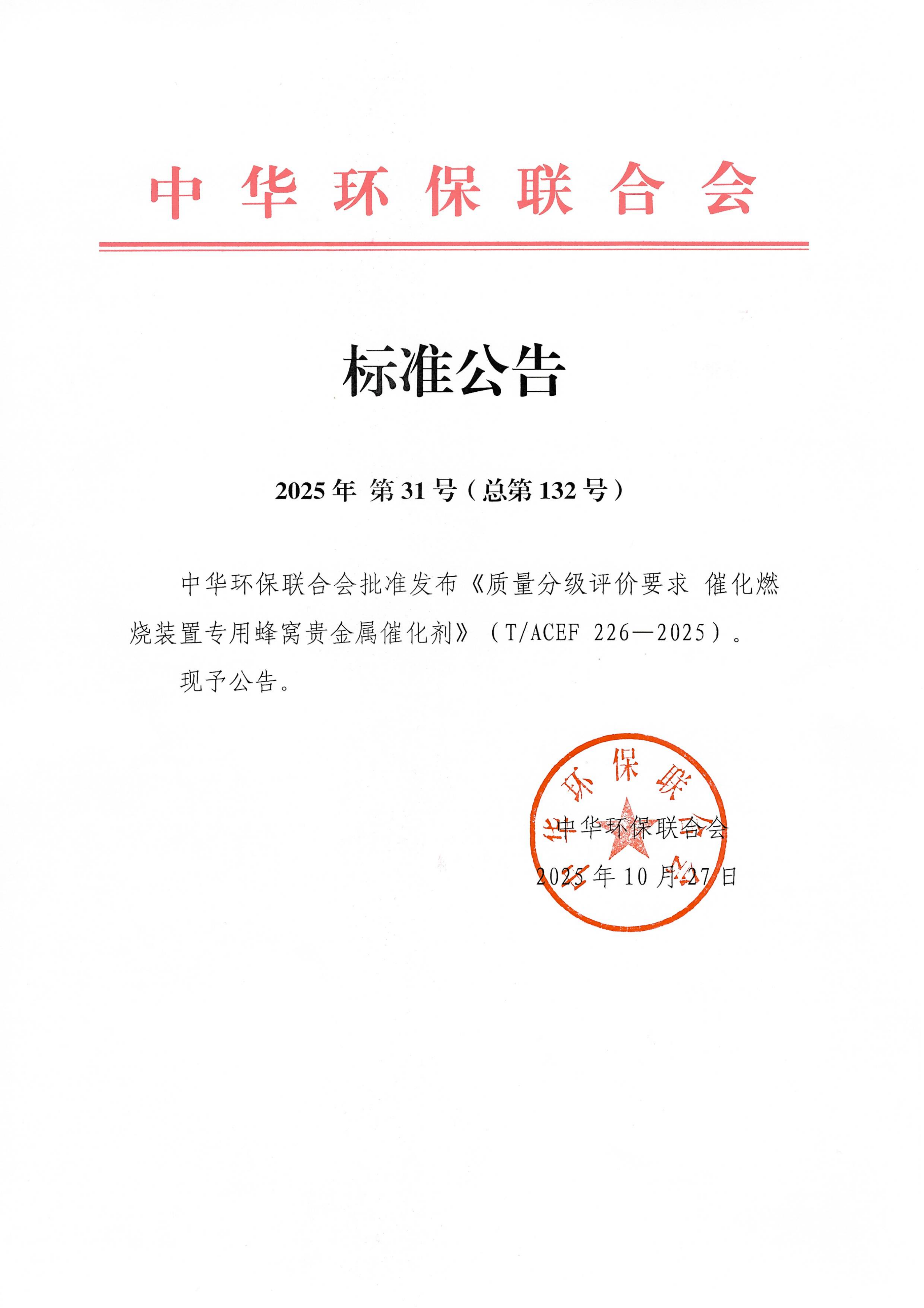中华环保联合会批准发布团体标准《质量分级评价要求 催化燃烧装置专用蜂窝贵金属催化剂》的公告