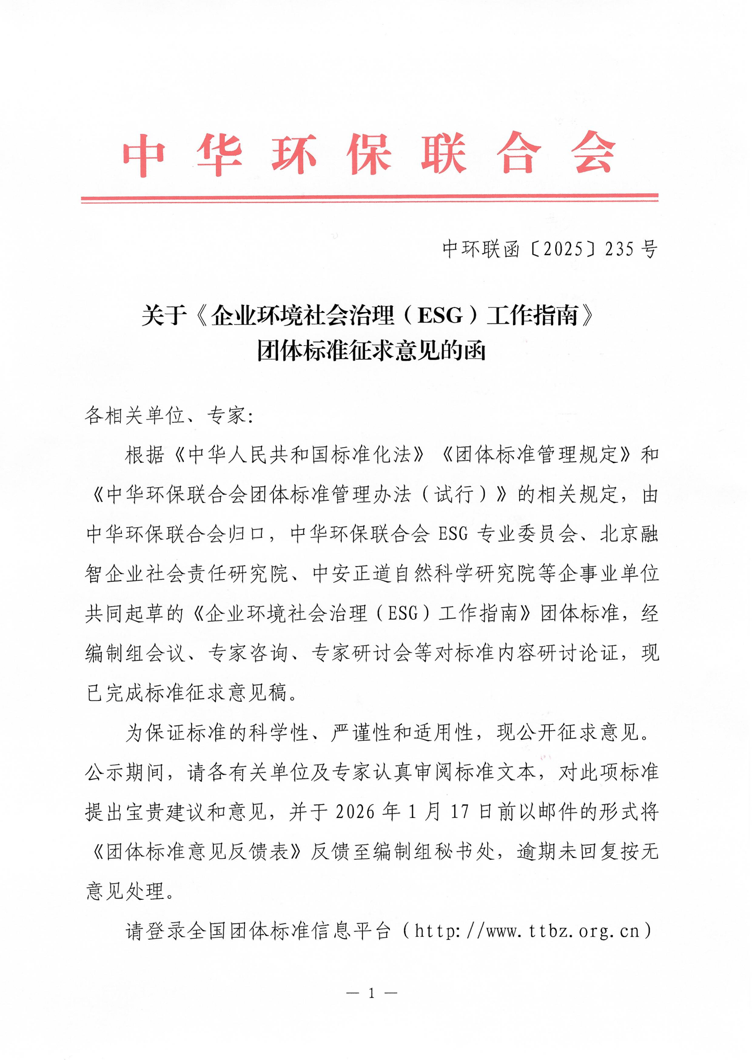 关于《企业环境社会治理(ESG)工作指南》团体标准征求意见的函
