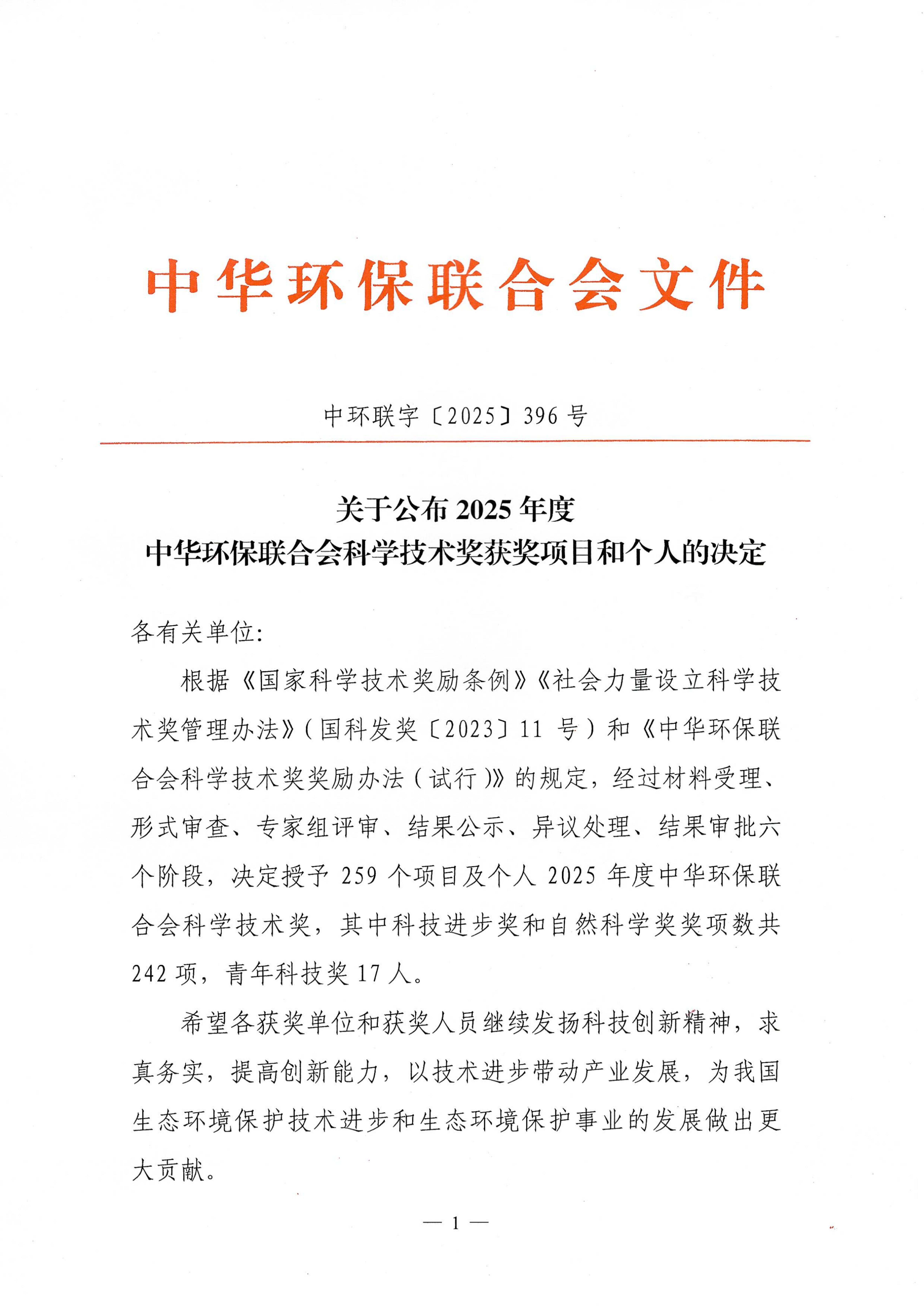 关于公布2025年度中华环保联合会科学技术奖获奖项目和个人的决定