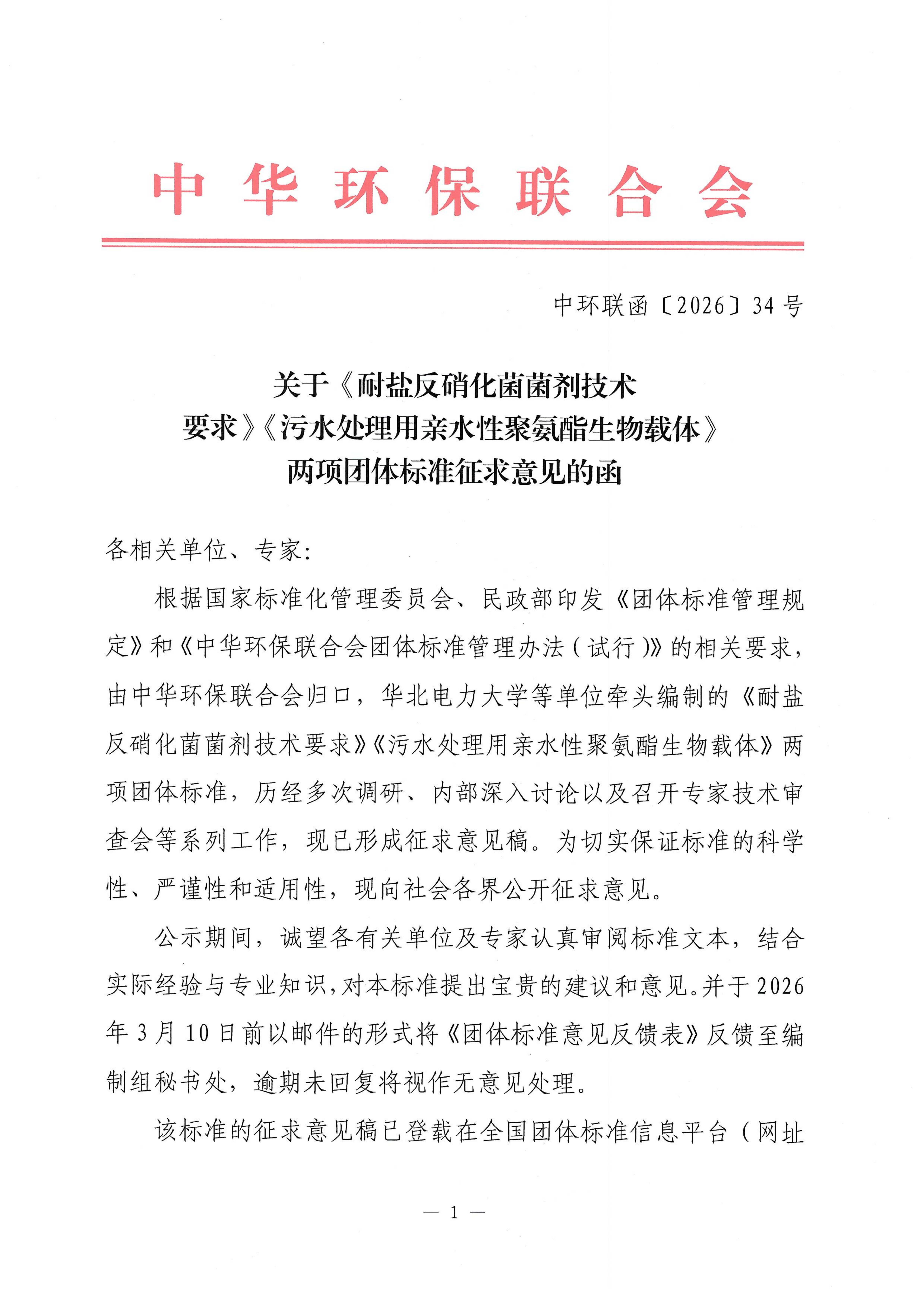 关于《耐盐反硝化菌菌剂技术要求》《污水处理用亲水性聚氨酯生物载体》两项团体标准征求意见的函