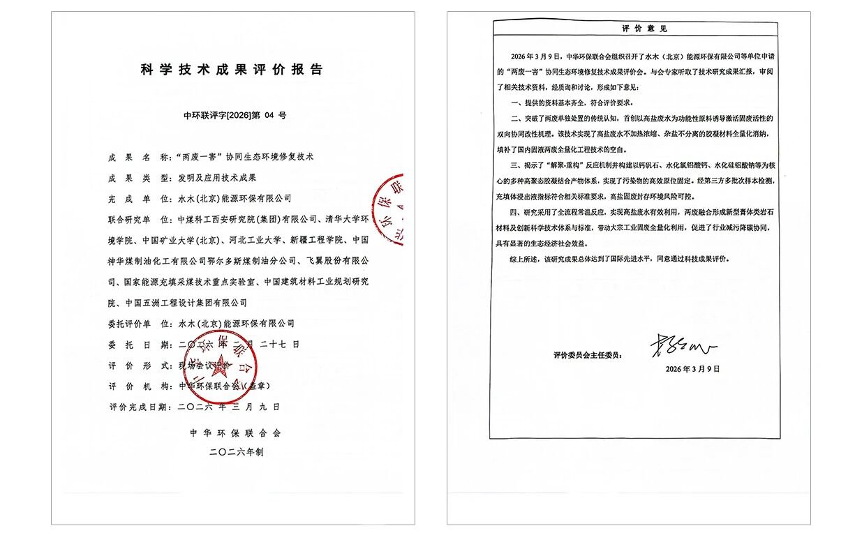 2026年3月9日,由中华环保联合会组织,来自工业废水、固危废资源化利用、环境法规政策、科学技术等领域权威专家,对水木湛清集团旗下水木(北京)能源环保有限公司研发的“两废一害”协同生态环境修复技术召开科学技术成果评价会。经专家组评审,一致认定该技术成果达到国际先进水平。
