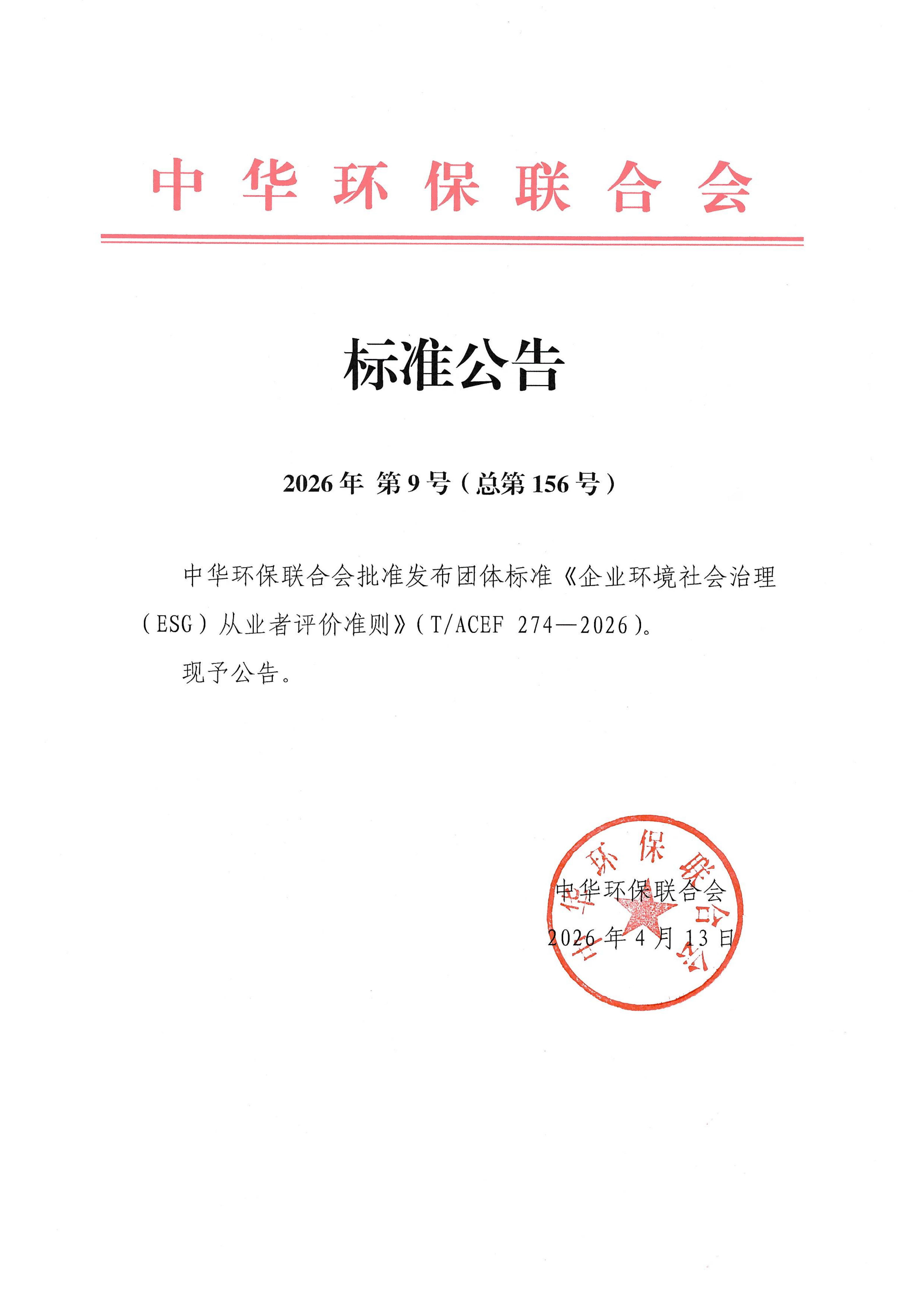 关于批准发布团体标准《企业环境社会治理(ESG)从业者评价准则》的公告