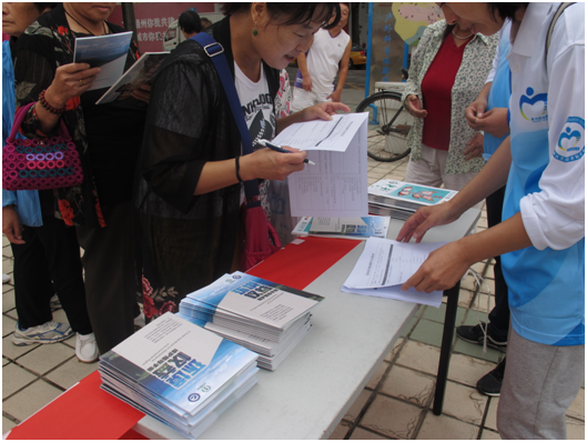 社区居民排队领取宣传材料、填写调查问卷