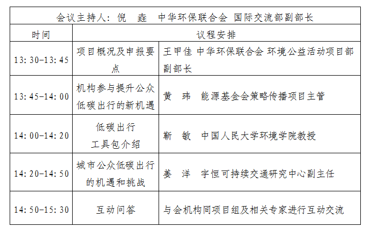 为更好的推动相关机构了解“益起低碳”策略传播小额资助计划(二期)项目概况及申报要点,提高相关机构在低碳出行议题上的公众传播与议题倡导能力,中华环保联合会拟于2022年3月2日组织线上项目说明会,介绍“益起低碳”策略传播小额资助计划(二期)项目概况、申报要点及机构参与提升公众低碳出行的新机遇,同时邀请相关专家对低碳出行工具包和城市公众低碳出行的机遇和挑战进行分享,活动具体安排如下: