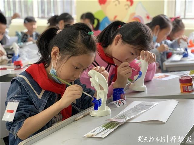 除此之外,大兴路小学“红领巾美术社团”的队员们,用画笔表达对江豚的热爱。他们为一头头“江豚”穿上美丽的衣服——把传统文化之京剧脸谱画在江豚的石膏像上,期盼着他们“游到长江”。