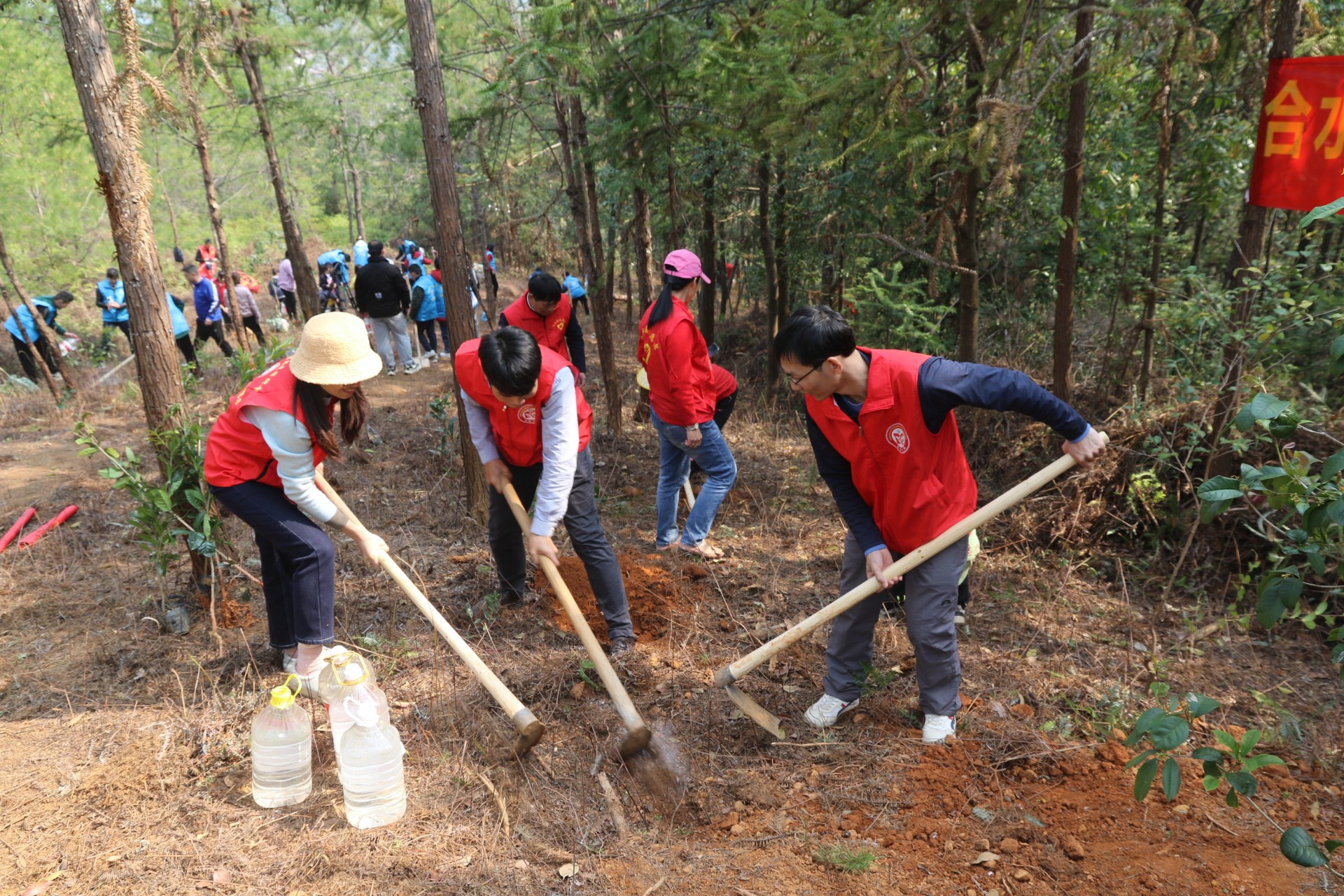 近日,广东省东莞市同沙生态园、河源市东江源公益林等地先后出现了一群熟悉的身影,他们手持环保志愿服务队旗帜,挥舞锄头和铁铲,栽种枫树、银杏、风铃木等树苗。今年3月,是东莞市生态环境局党员“学雷锋践初心”志愿服务月,这群熟悉的身影正是东莞市生态环境局党员志愿者,植树活动是志愿服务月活动的其中之一。