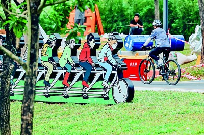 一位市民在装置艺术作品《绿色出行》旁骑行。深圳市龙岗区委宣传部供图