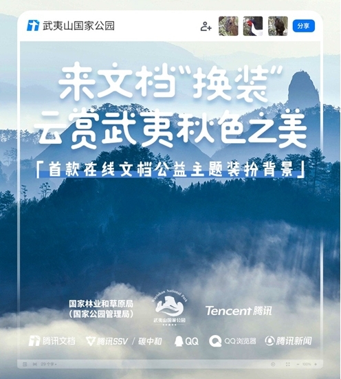 自去年起,腾讯文档持续通过打造互动功能,向公众倡导普及低碳环保的理念及行为。秋分之际,联合武夷山国家公园推出的国内首款在线文档公益主题装扮背景,将群峰日出、狮峰云海、黄岗林海、三才秋色、齐云茶园、黄叶秋深6种武夷山国家公园内极具代表性的景物风光,“搬”到用户桌面,让超过58万的用户实现了云赏祖国秋色、拥抱有氧工作的体验。