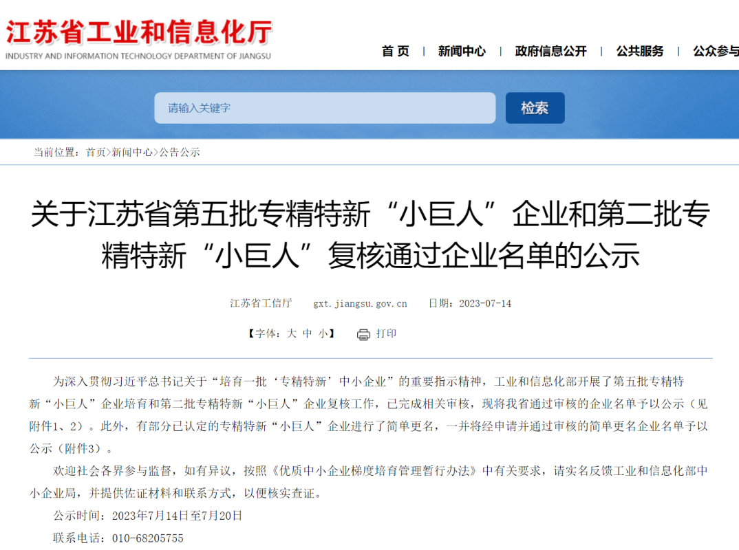 近日,根据工信部统一部署,江苏省工信厅发布《关于江苏省第五批专精特新“小巨人”企业和第二批专精特新“小巨人”复核通过企业名单》,经公示后,