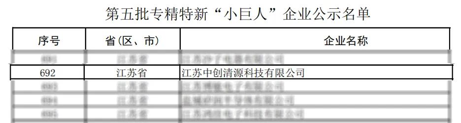 江苏中创清源科技有限公司被认定为国家级专精特新“小巨人”企业。