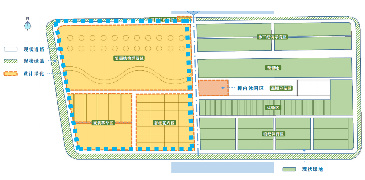 园林乔灌木示范区:是对污泥产品在园林利用这一重要方向的集中展示,包含乔木展示区、灌木展示区、花卉展示区和地被展示区,涵盖了典型园林植物种类,园林场景丰富。从展示区南入口位置视角来看,呈现出由近及远高度递增的园林场景,并可满足不同种类植物光照需求,体现出乔灌花卉利用展示区观赏角度整体的协调性与美观性。