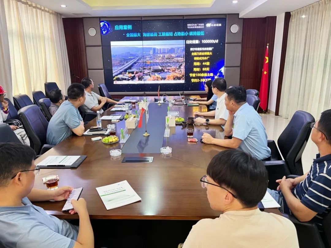 交流中,公司总经理潘海龙对无锡水务集团、鑫明新能源代表的到来表示由衷感谢。企划部负责人曹晖就公司发展历程、装配式污水(净水)厂核心技术、典型案例、标准化模块化装配式智能制造产线进行详细讲解,并前往观察光伏项目现况。