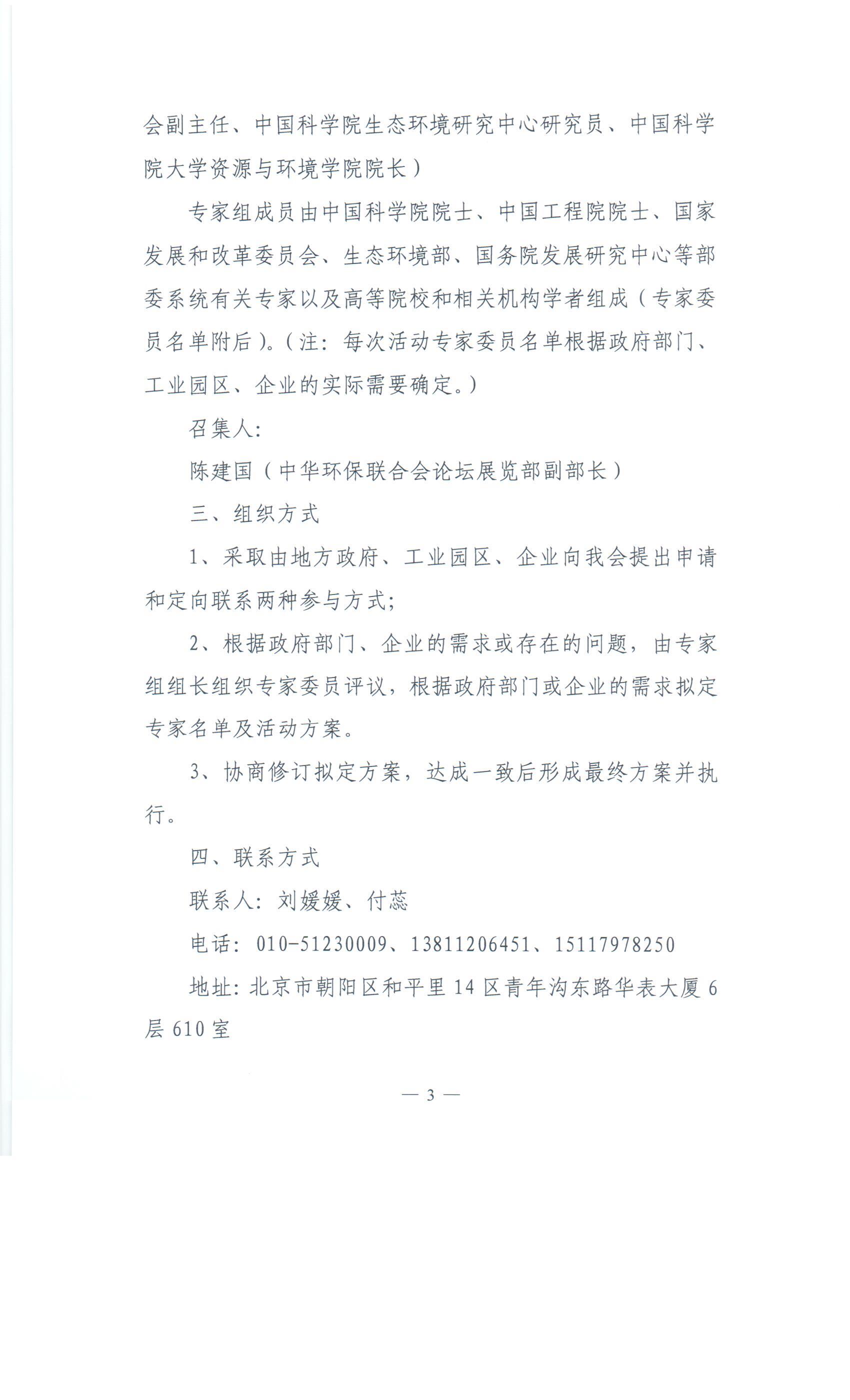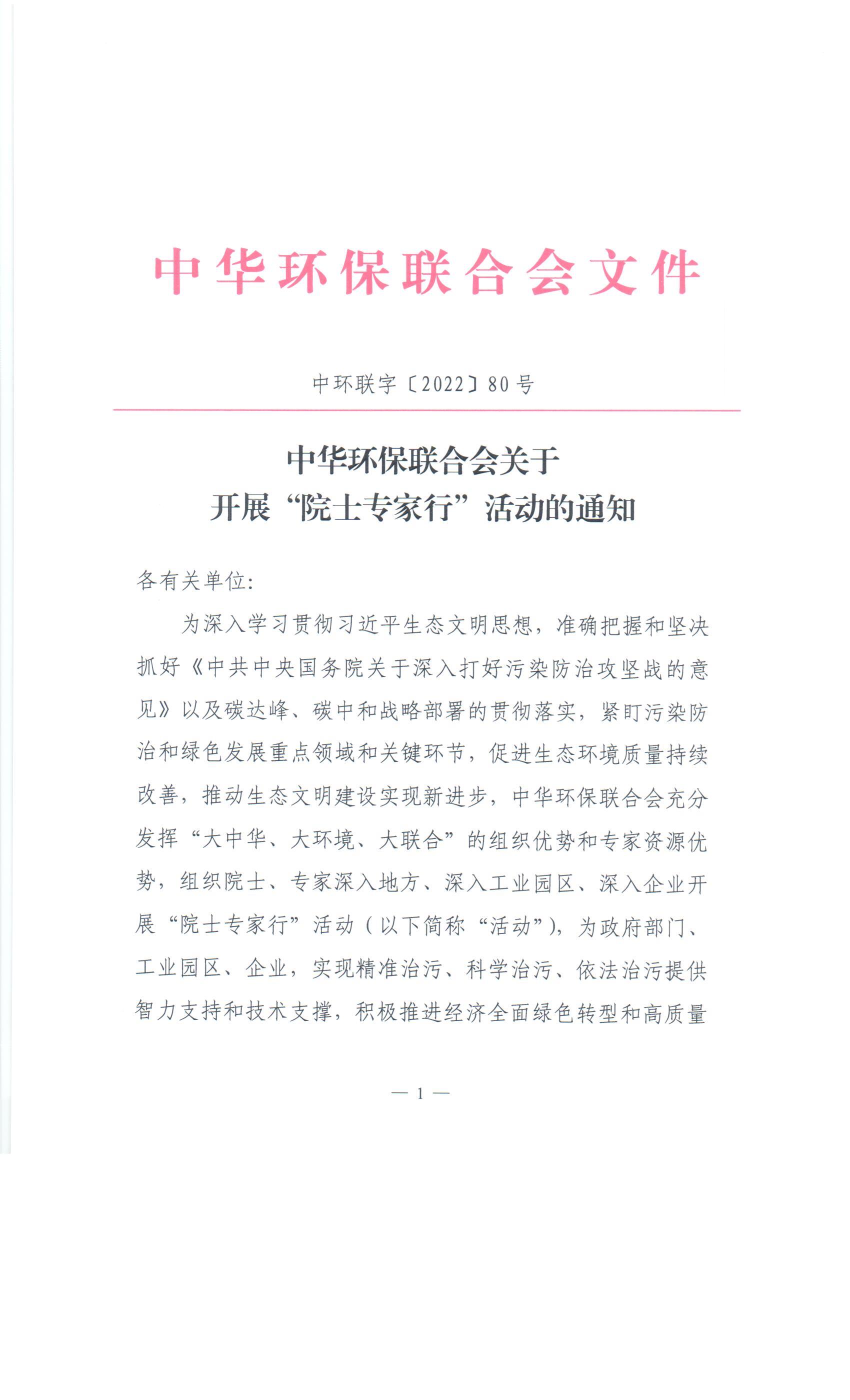 为深入学习贯彻习近平生态文明思想,准确把握和坚决抓好《中共中央国务院关于深入打好污染防治攻坚战的意见》以及碳达峰、碳中和战略部署的贯彻落实,紧盯污染防治和绿色发展重点领域和关键环节,促进生态环境质量持续改善,推动生态文明建设实现新进步,中华环保联合会充分发挥“大中华、大环境、大联合”的组织优势和专家资源优势,组织院士、专家深入地方、深入工业园区、深入企业开展“院士专家行”活动(以下简称“活动”),为政府部门、工业园区、企业,实现精准治污、科学治污、依法治污提供智力支持和技术支撑,积极推进经济全面绿色转型和高质量发展,为建设美丽中国贡献力量。
