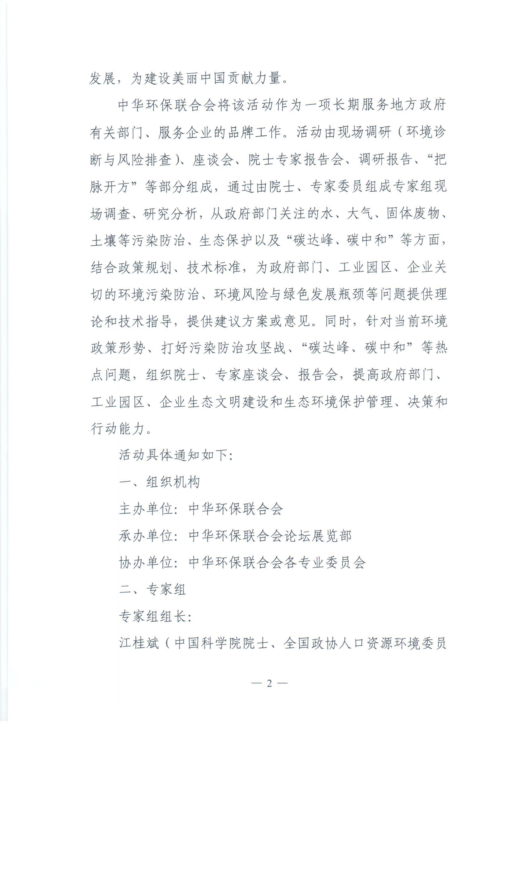 中华环保联合会将该活动作为一项长期服务地方政府有关部门、服务企业的品牌工作。活动由现场调研(环境诊断与风险排查)、座谈会、院士专家报告会、调研报告、“把脉开方”等部分组成,通过由院士、专家委员组成专家组现场调查、研究分析,从政府部门关注的水、大气、固体废物、土壤等污染防治、生态保护以及“碳达峰、碳中和”等方面,结合政策规划、技术标准,为政府部门、工业园区、企业关切的环境污染防治、环境风险与绿色发展瓶颈等问题提供理论和技术指导,提供建议方案或意见。同时,针对当前环境政策形势、打好污染防治攻坚战、“碳达峰、碳中和”等热点问题,组织院士、专家座谈会、报告会,提高政府部门、工业园区、企业生态文明建设和生态环境保护管理、决策和行动能力。活动具体通知如下文。