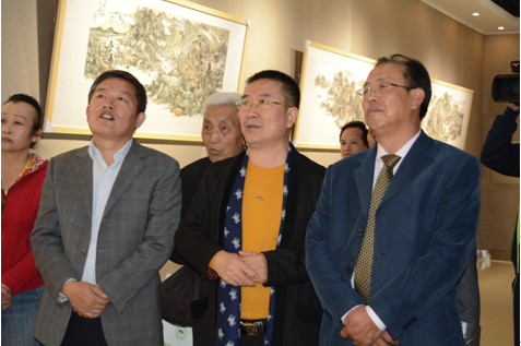 中华环保联合会秘书长顾问谷茂宽(右一)、临沂市环境保护局党组副书记冯凡华(左一)在何占福陪同下观看画展。