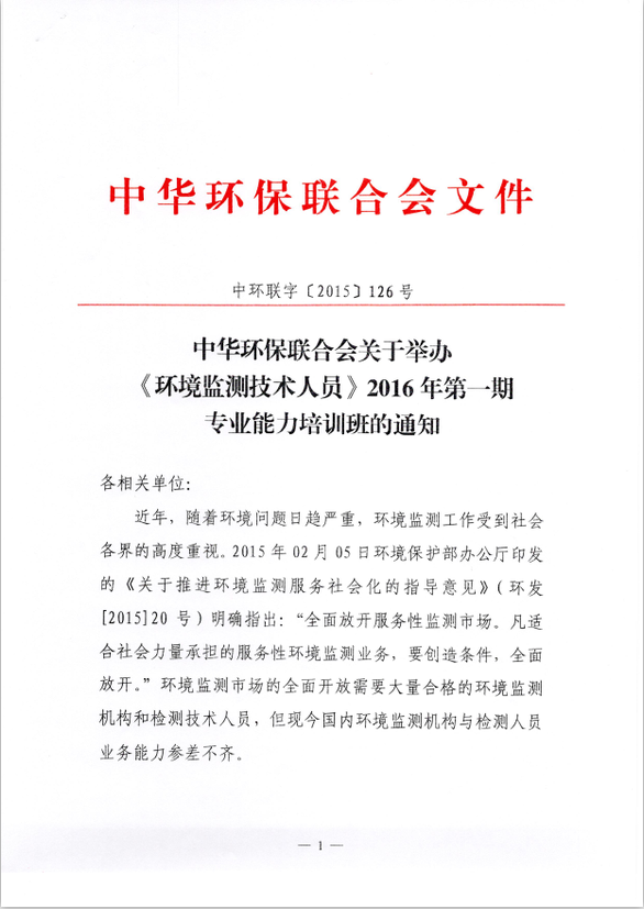 中华环保联合会关于举办《环境监测技术人员》2016年第一期专业能力培训的通知