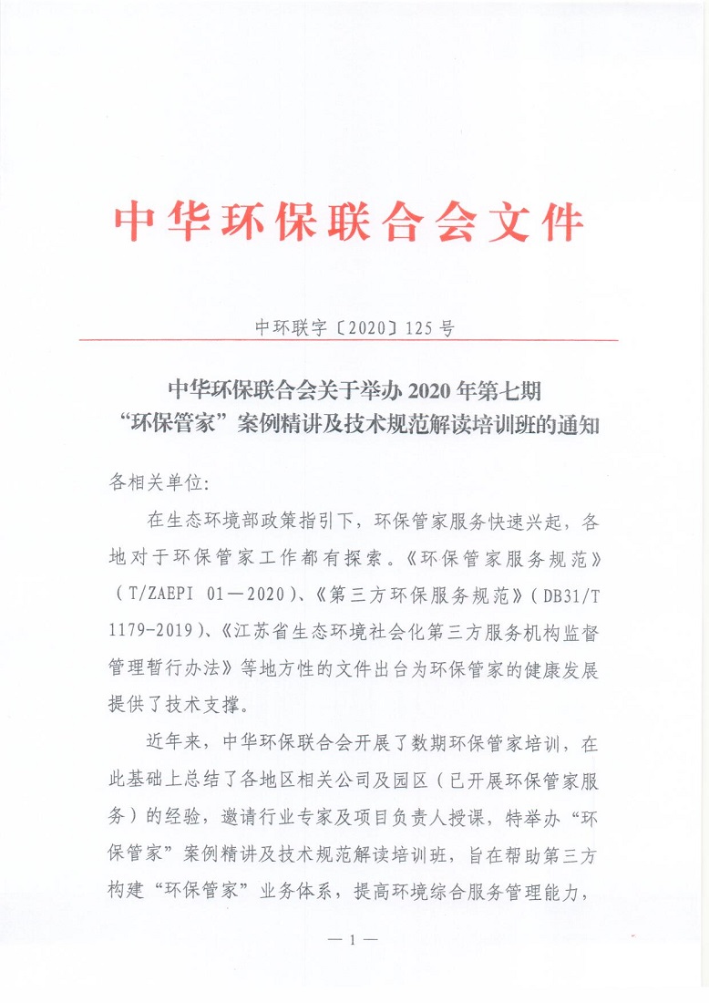 关于举办2020年第七期 “ 环保管家 ” 案例精讲及技术规范解读培训班的通知