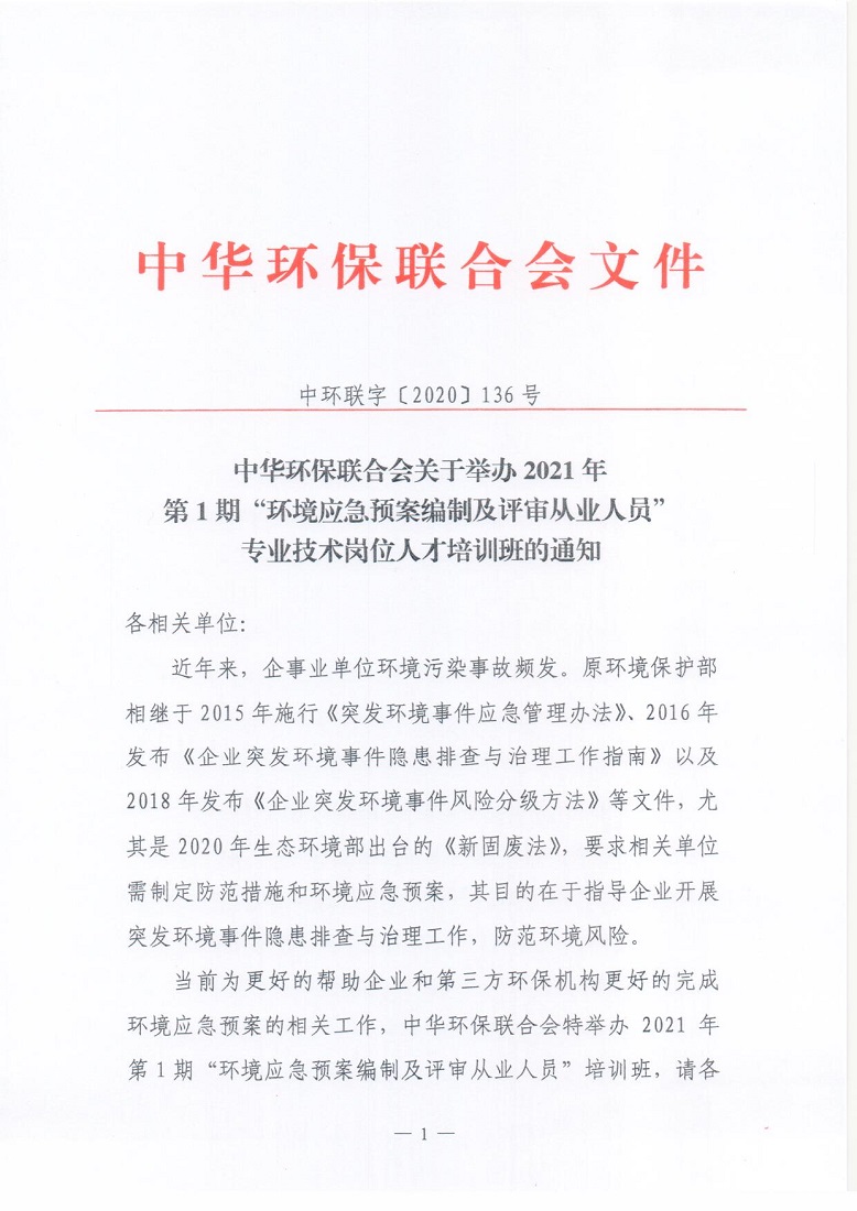 关于举办2021年第1期“环境应急预案编制及评审从业人员”专业技术岗位人才培训班的通知