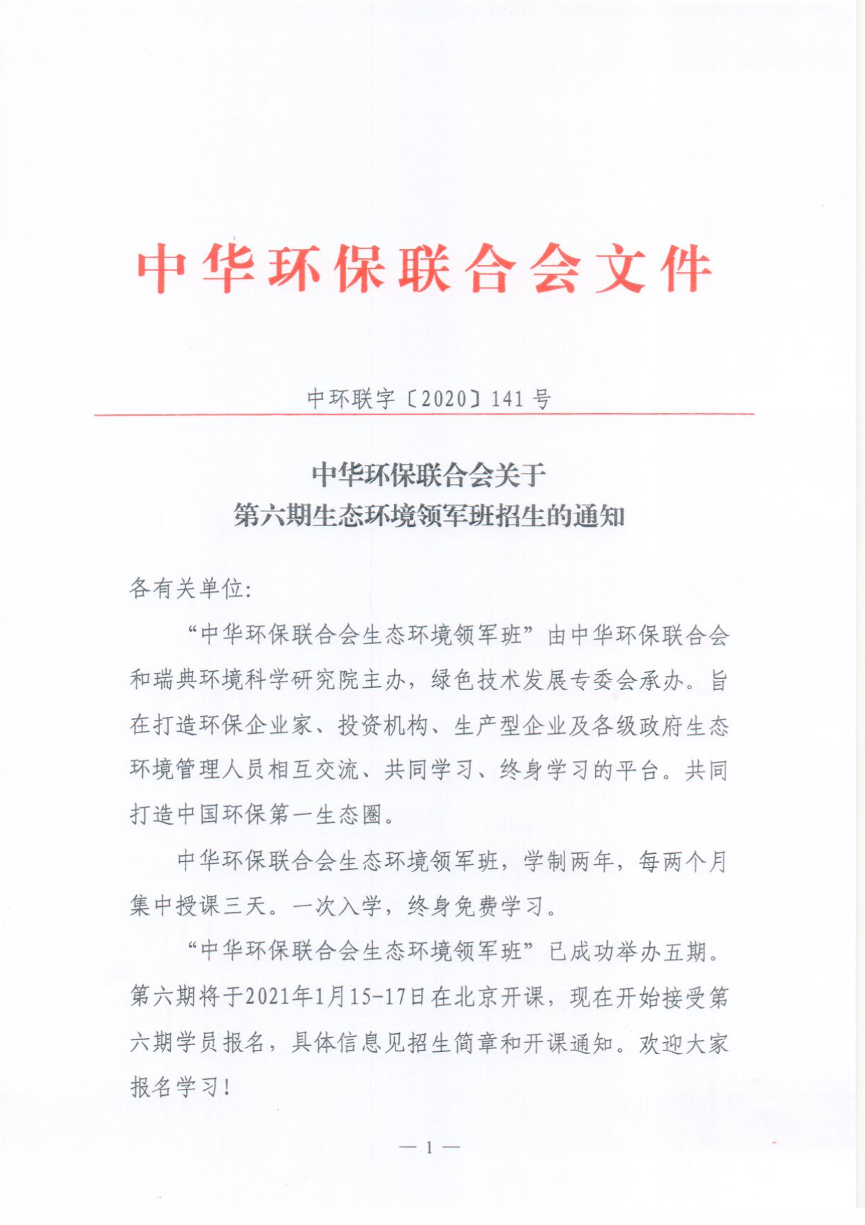 第六期中华环保联合会生态环境领军班招生通知