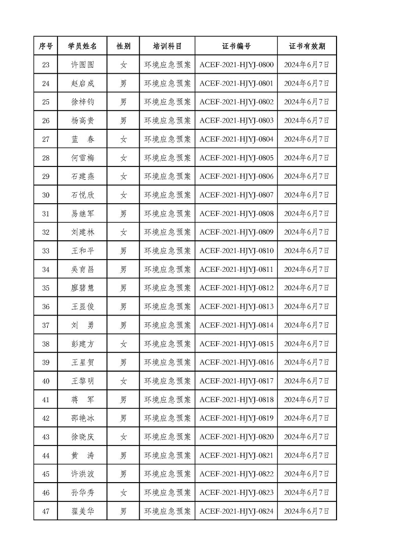 2021年第5期“环境应急预案编制及评审从业人员” 专业技术人才培训合格学员名单