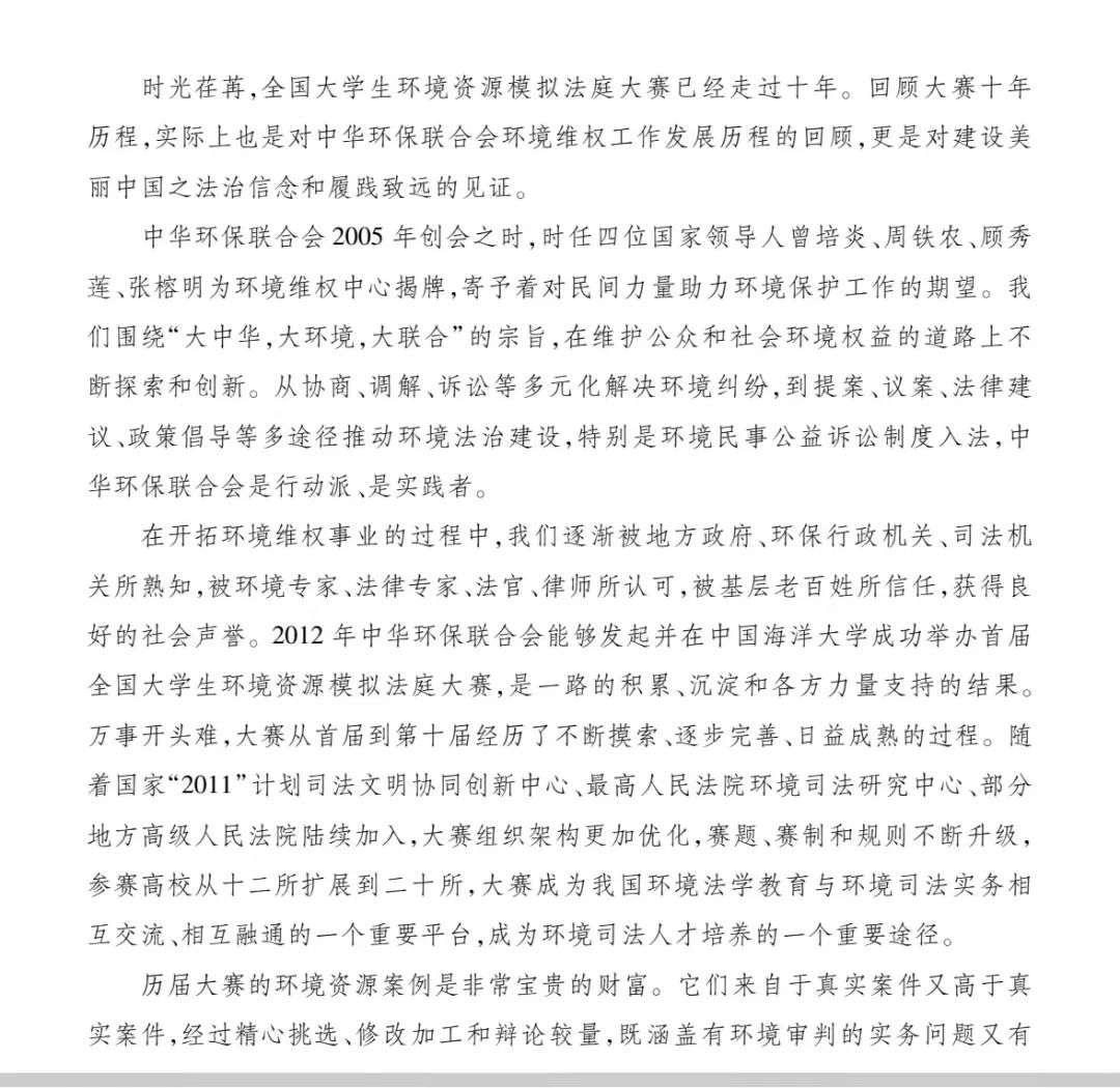 近日,《全国大学生环境资源模拟法庭大赛案例解析》一书已由法律出版社出版,在全国公开发行。本书既是一部可称之为精品的环境法案例教程,同时也是一部不可多得的由环境法官撰稿的环境法学术著作。