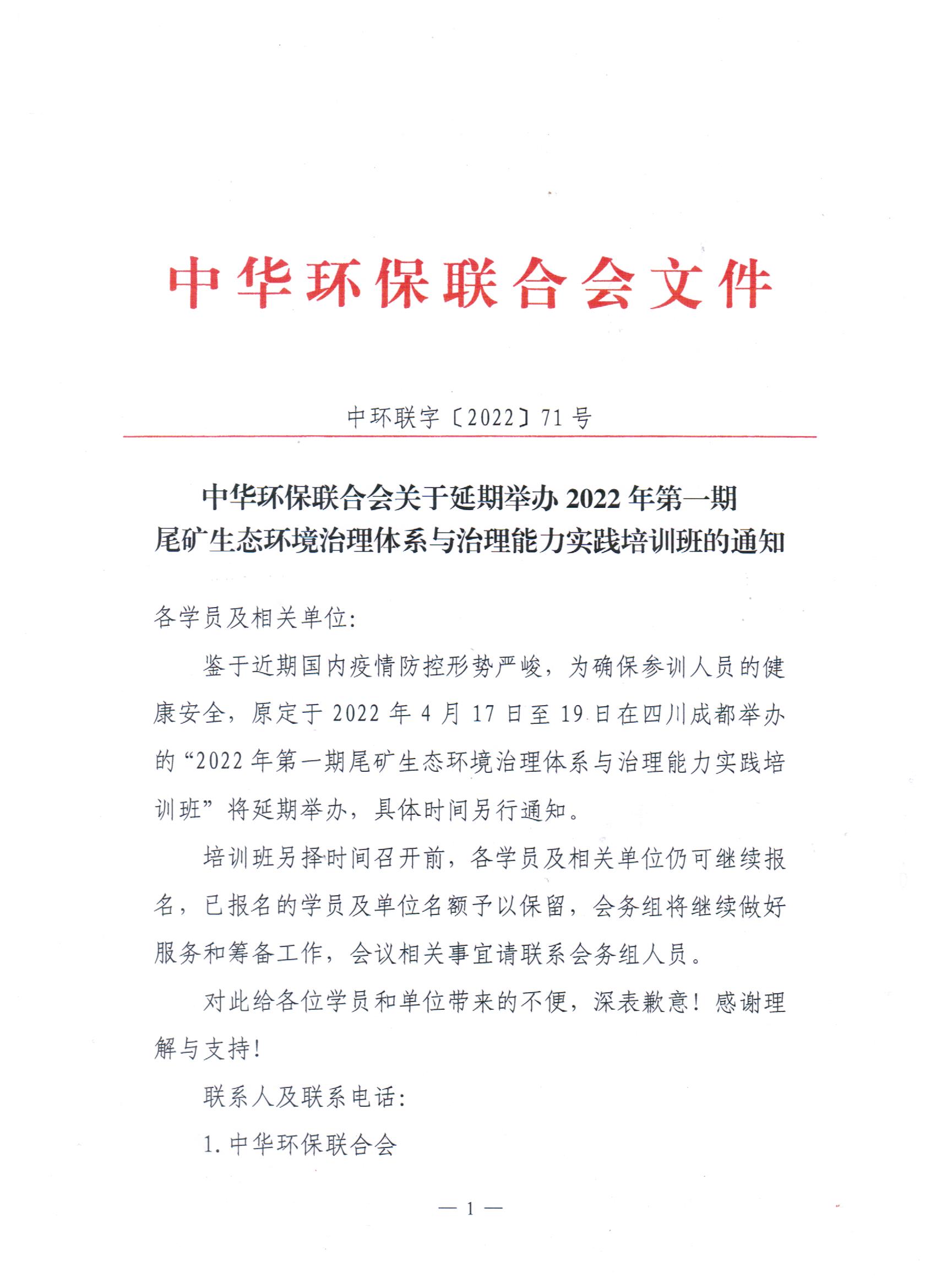 关于延期举办2022年第一期尾矿生态环境治理体系与治理能力实践培训班的通知