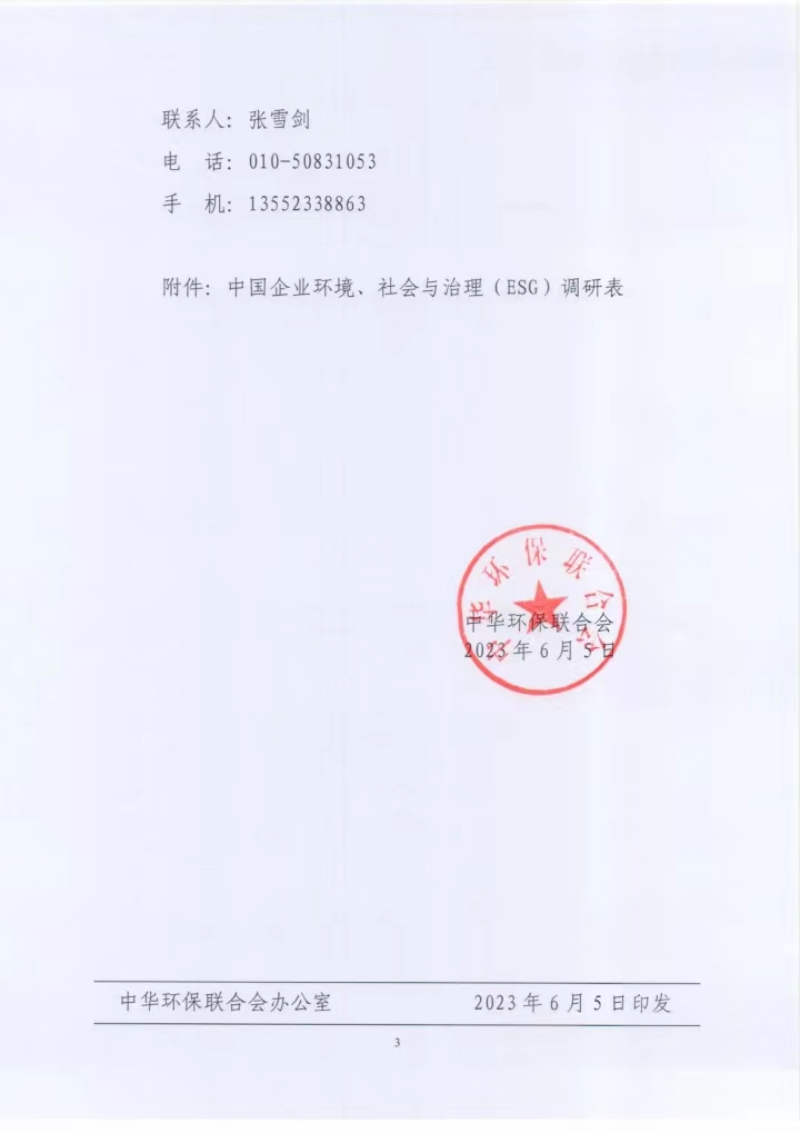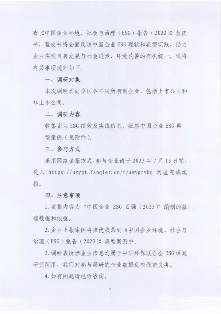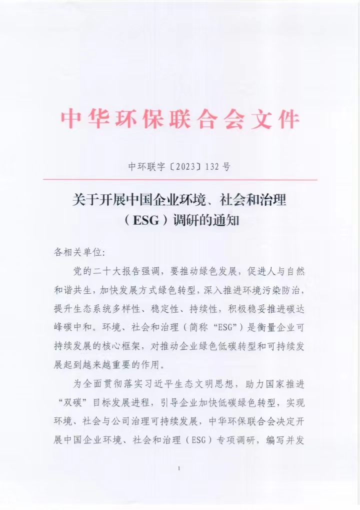 关于开展中国企业环境、社会和治理(ESG)调研的通知