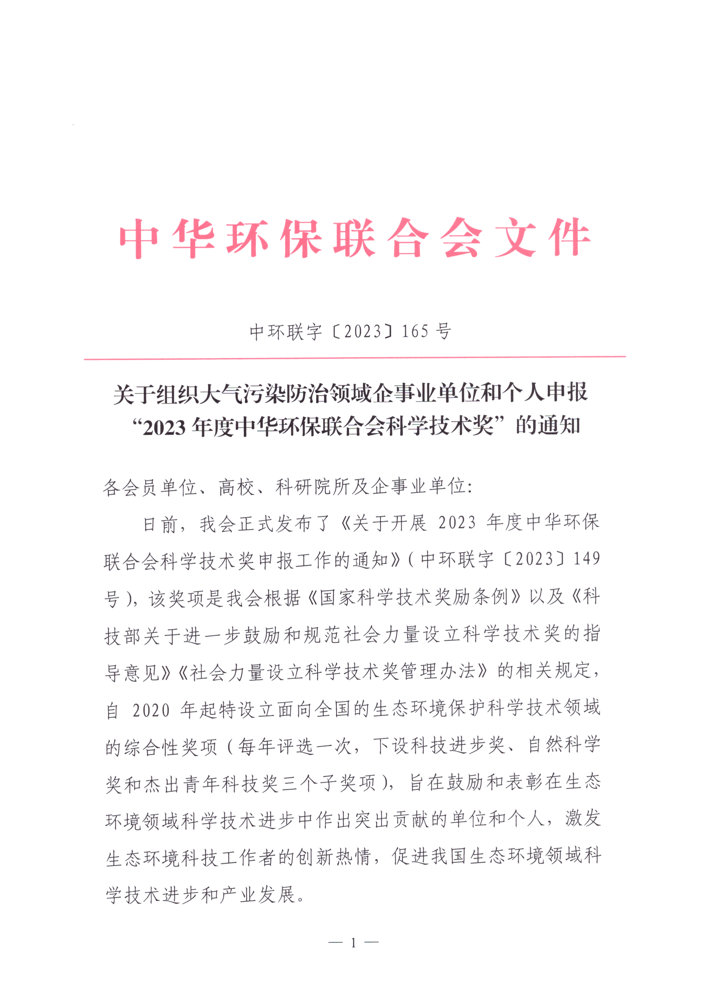 关于组织大气污染防治领域企事业单位和个人申报 “2023年度中华环保联合会科学技术奖”的通知