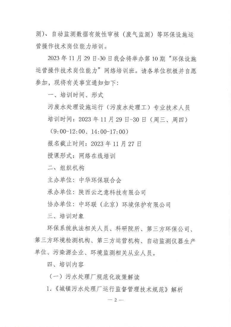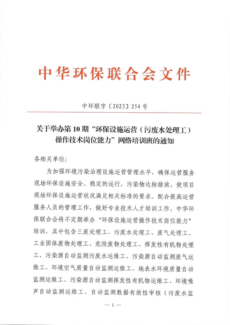 关于举办第10期“环保设施运营(污废水处理工)操作技术岗位能力”网络培训班的通知