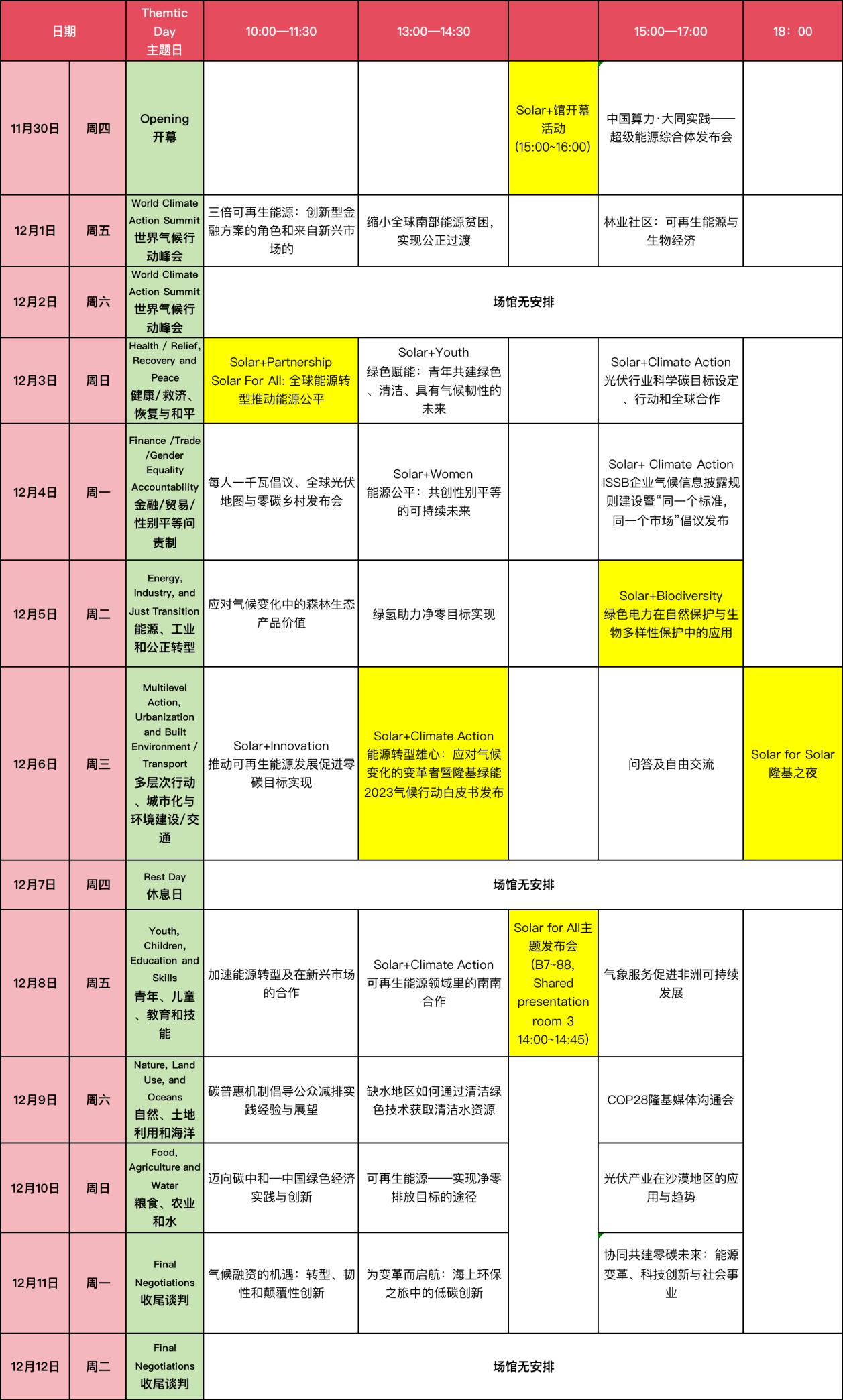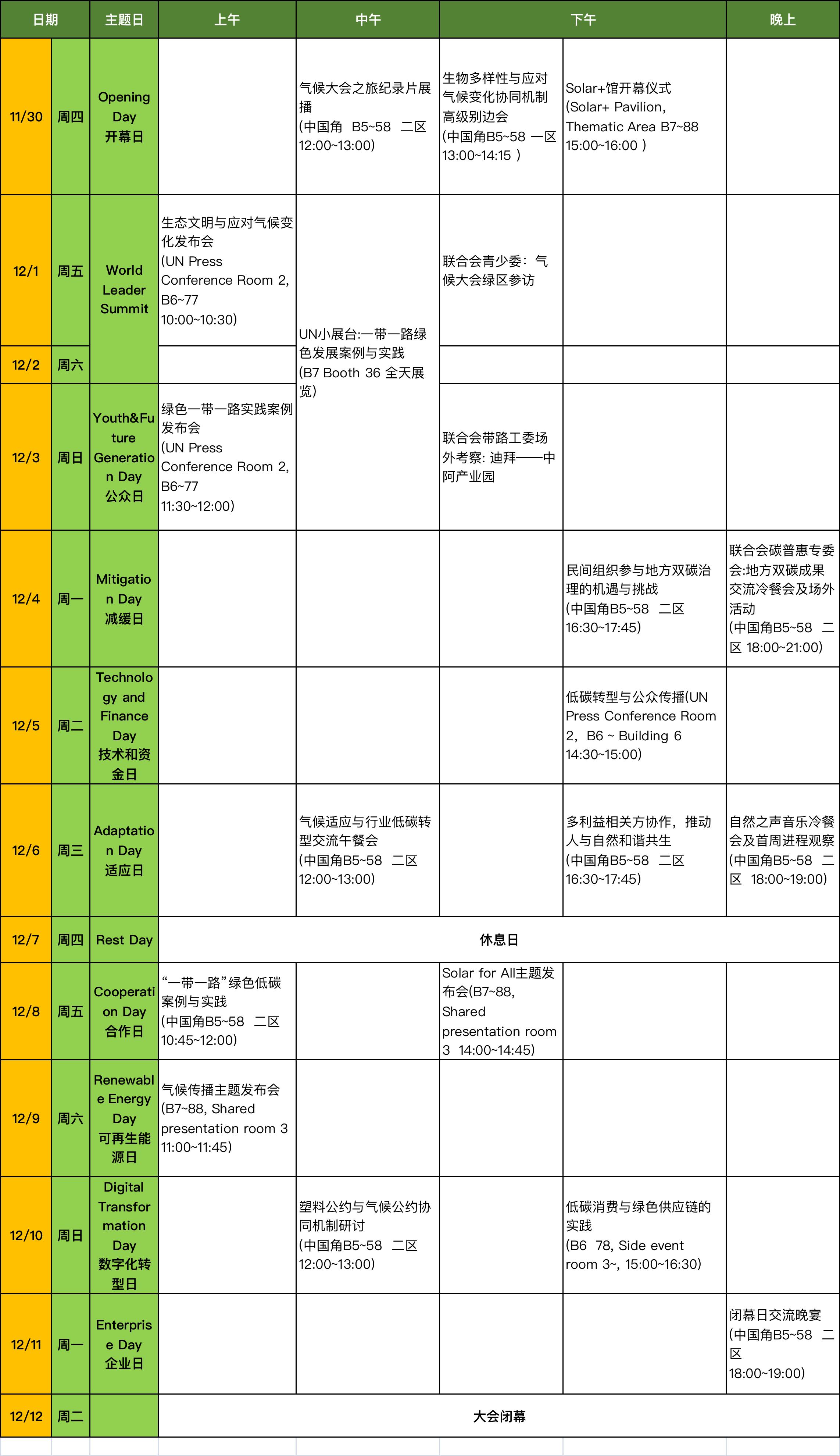 中华环保联合会独立场馆两周活动清单(场馆位置 B7  88, COP28 Blue Zone, Expo City, Dubai.  办公室位置B3  31)