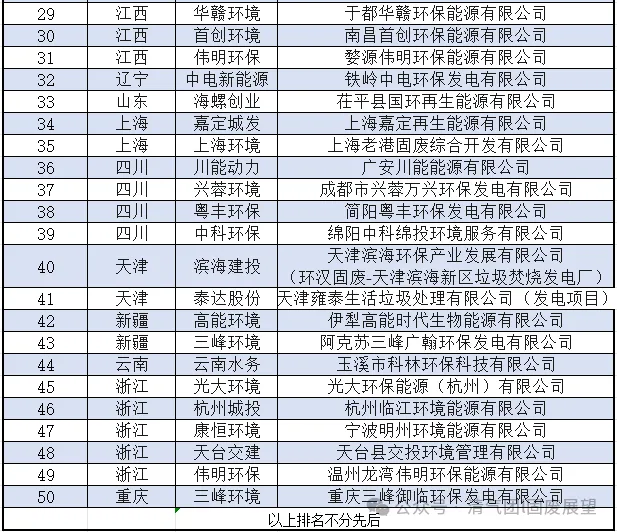 同样,我们对全国达标的356个垃圾焚烧清洁发电项目,通过横纵向数据科学比对,结合行政划分和地理分布的区域典型特性,兼顾城市级别差异,优选出以下50个项目进入备选名单,涉及21个省和直辖市。