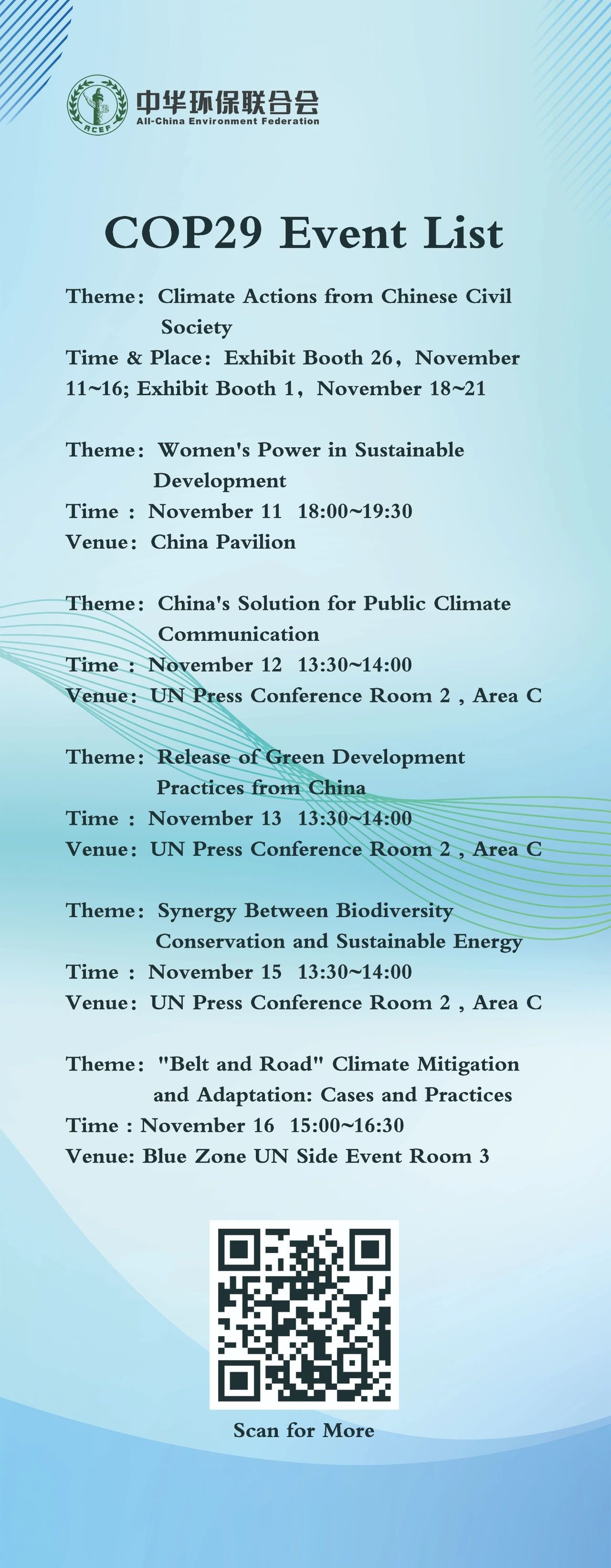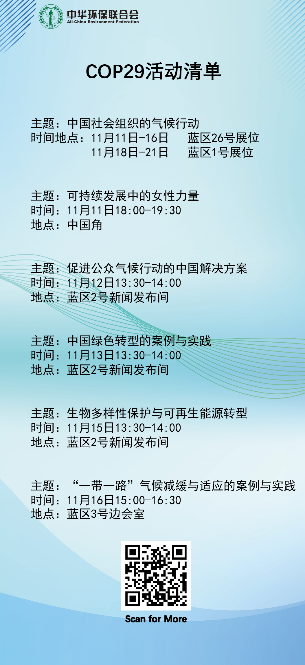 联合国气候变化框架公约第29次缔约方大会(COP29)即将于11月11日~22日在阿塞拜疆巴库举办,中华环保联合会将在大会期间,围绕绿色“一带一路”、可再生能源发展与生物多样性协同、气候传播等主题组织多场边会和展览活动。诚邀各界人士参会交流,相关活动信息如下: