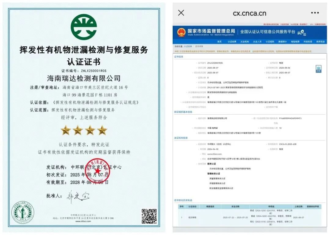 海南瑞达检测荣获国内首个挥发性有机物泄漏检测与修复服务认证四星认证