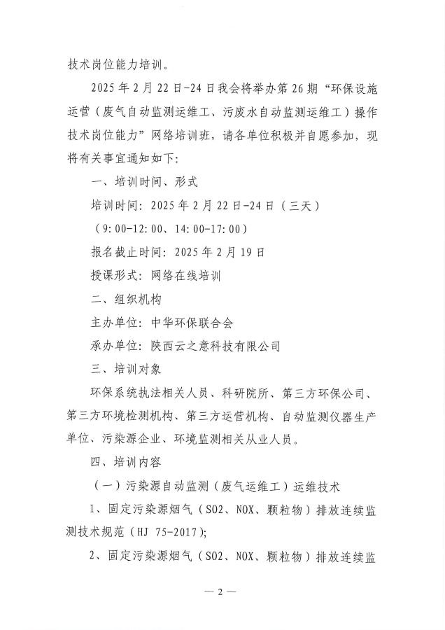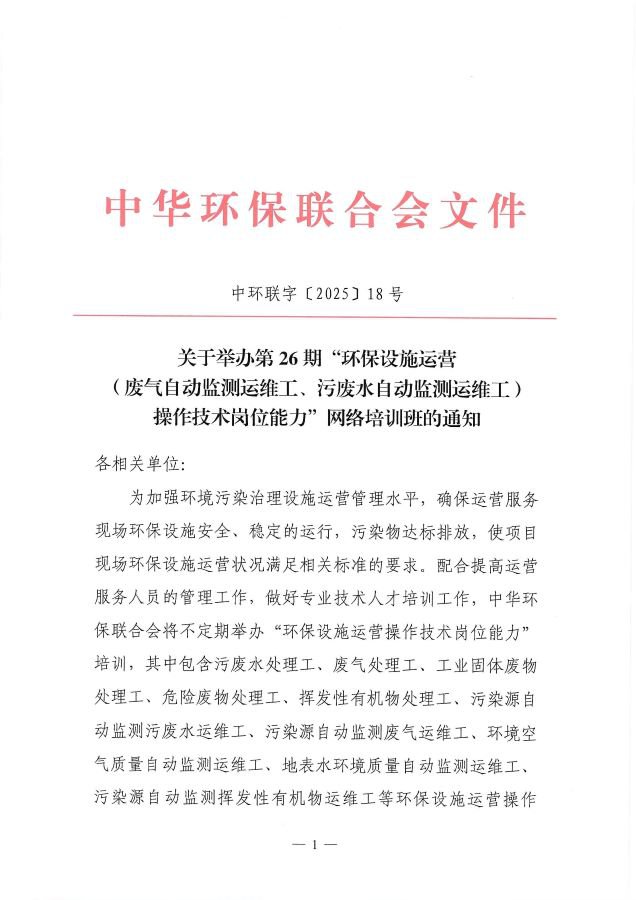 关于举办第26期“环保设施运营(废气自动监测运维工、污废水自动监测运维工)操作技术岗位能力”网络培训班的通知