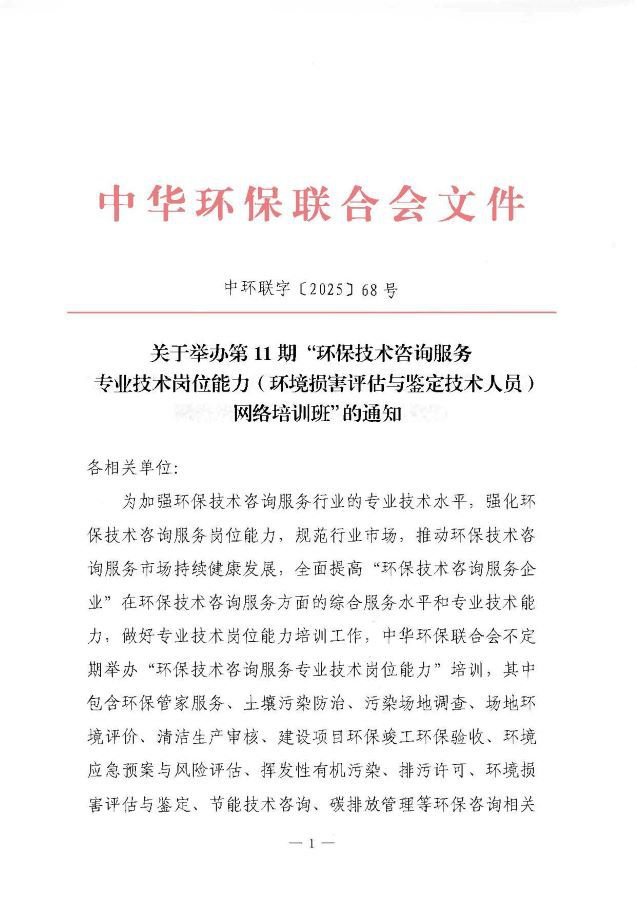 关于举办第11期“环保技术咨询服务专业技术岗位能力(环境损害评估与鉴定技术人员)网络培训班”的通知