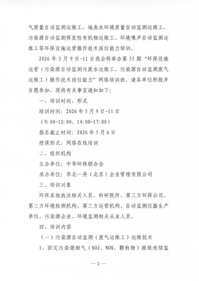 关于举办第55期“环保设施运营(污染源自动监测污废水运维工、污染源自动监测废气运维工)操作技术岗位能力”网络培训班的通知